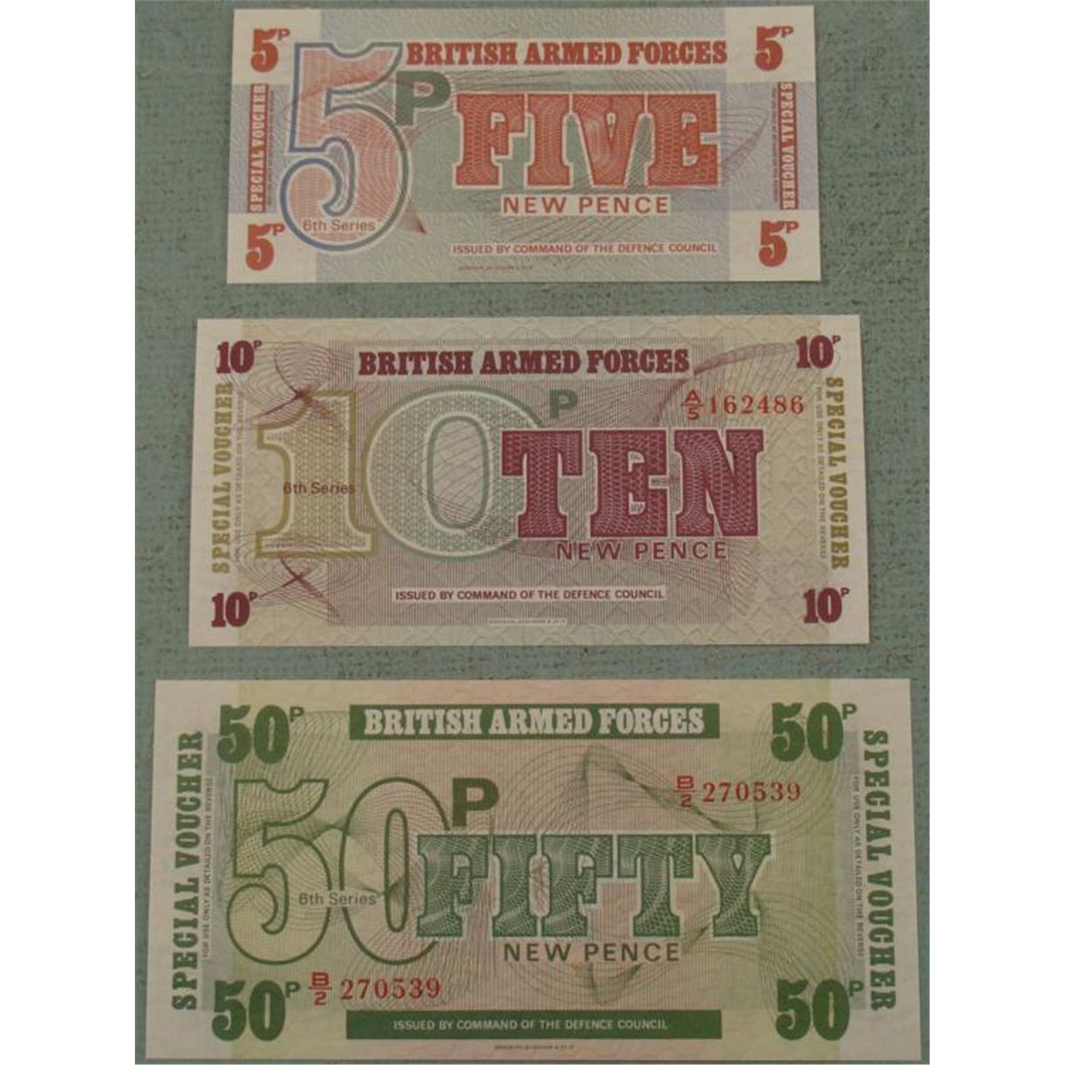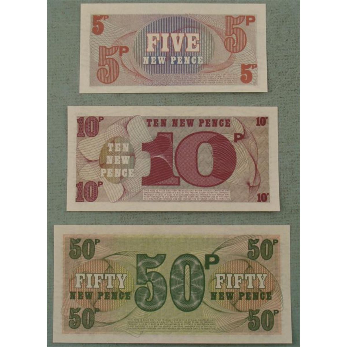 3 1972 notes issued by the British Defense Council * Notes: 50, 10, 5 PenceCondition: Gem Uncirculated
