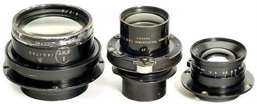 3 British Lenses 1) Taylor & Hobson: British lens, unmarked, with army engraving 2,9/8 in., engraving: J.H.D. 1 14A/780, iris stop, with screw-in lens ring. - 2) Wide-angle lens: "1:4/5 in.", engraving with royal crown and AM., no. 14A/843, with screw-in lens ring, iris stop, clean lens. - And: 3) Ross, London: "Telecentric 6,8/12 in.", with shutter 1-1/300 sec.<Br>