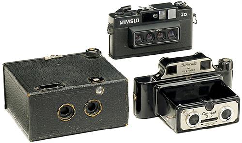 3 englische Stereo-Kameras 1) "Stereo Puck", 1932, Thornton-Pickard, Altrincham. Für 60 x 40 mm auf Rollfilm 120, klassische Stereo-Box-Kamera mit Brillantsucher. (3/3) - Und: 2) "Coronet 3-D", 1953, Coronet, Birmingham. Für 40 x 50 mm auf Rollfilm 127, Fixfokus-Objektive, Einzeiten-Verschluß, Bakelit-Kamera mit originellem Binokular-Sucher. (3+/3) - Sowie: "Nimslo 3D", 1980, Nimslo, London. Für Stereo-Rasterbilder, kein Stereo-Betrachter erforderlich. Mit Anleitung und Papieren. Neuwertig. (1-/2)