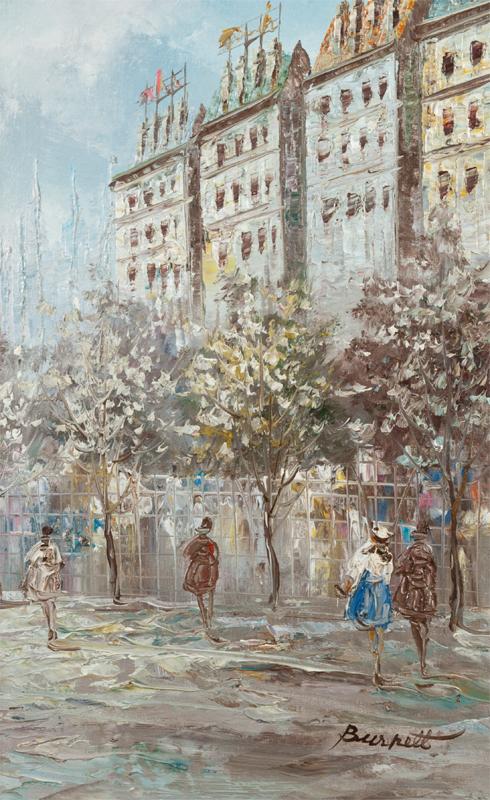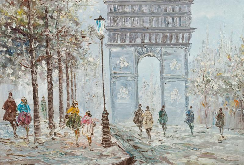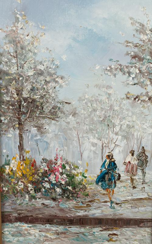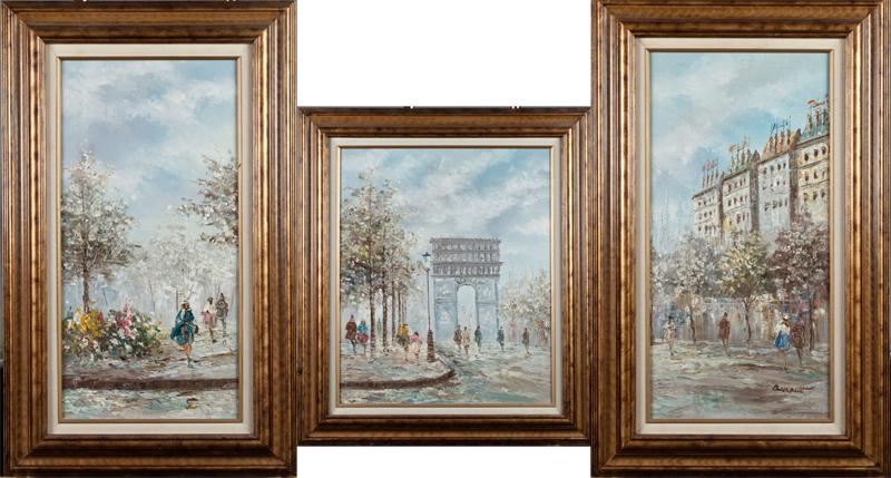 Three sectioned painting depicting a Parisian street scene with figures. Separated into three parts, center measures 24" H x 20" W (sight), and sides measure 24" H x 12" W, (sight) with 4.25" for matting and frame. Signed on left piece in LL. 20th Century.