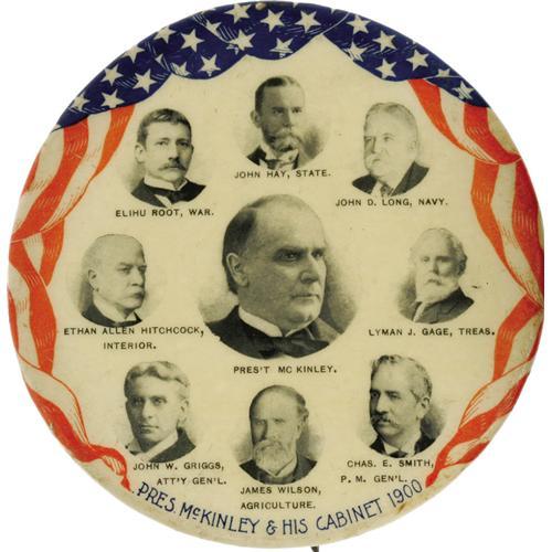 <B>Colorful Large 3" Button Picturing President McKinley and his Cabinet.</B></I> A great 1900-dated item, picturing Elihu Root, John Hay, and the rest of his cabinet. Beautiful condition, with just the tiniest hint of soiling on the bottom edge noted for strictest accuracy. <I>From the Norman Loewenstern Collection.</B></I>