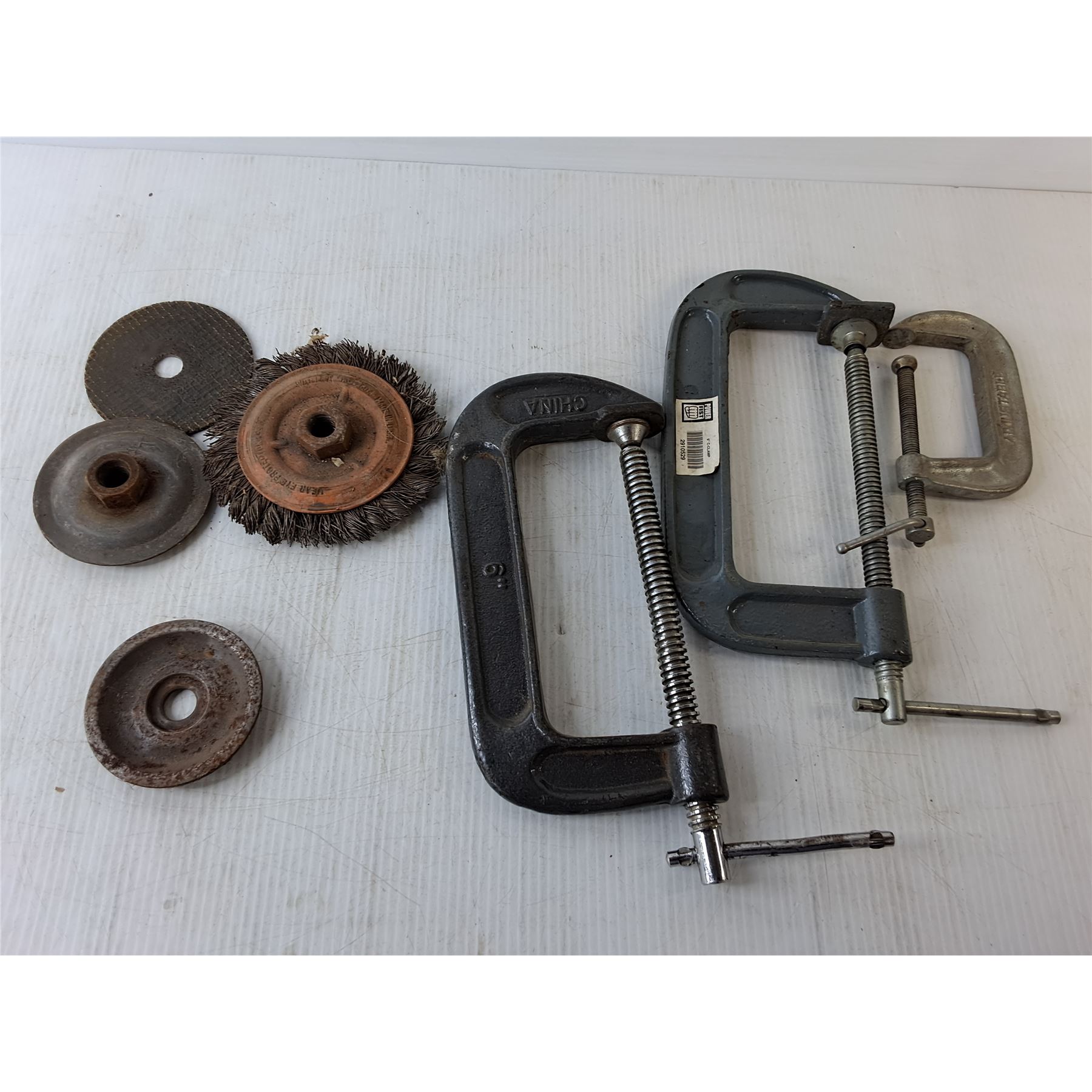 (3) C-Clamps, Brush Tool Lot- Wire Wheel, Cutting Disc, Misc.