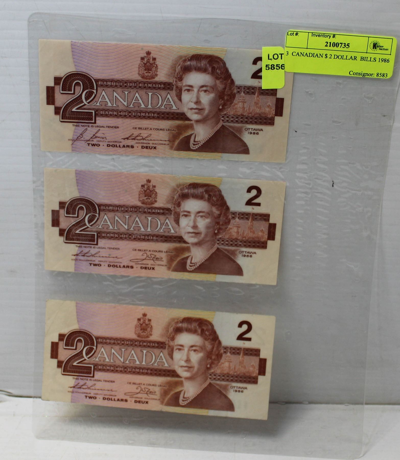 3 CANADIAN $ 2 DOLLAR BILLS 1986