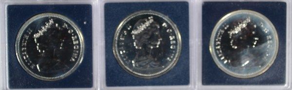 1982 REGINA STOCK YARDS, 1987 DAVIS STRAIT, AND 1984 TORONTO. ESTIMATE $70.00 TO $80.00 EACH DOLLAR HAS .375 OUNCES OF SILVER