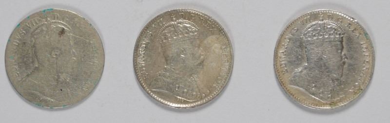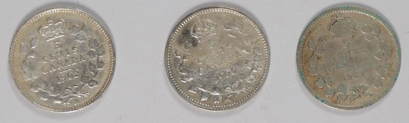 3 - CANADIAN SILVER FIVE CENTS; 1902, 1905, 1907 - VG/FINE
