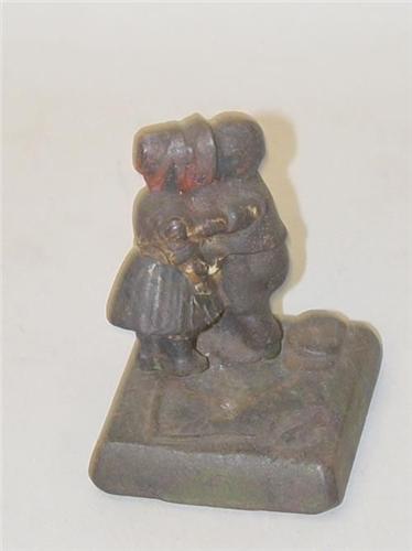 3" CAST IRON PAPERWEIGHT W/ KISSING COUPLE (SUNBONNET GIRL) W/ TRACES OF OLD PAINT-UNMARKED - WEAR & IMPERFECTIONS
