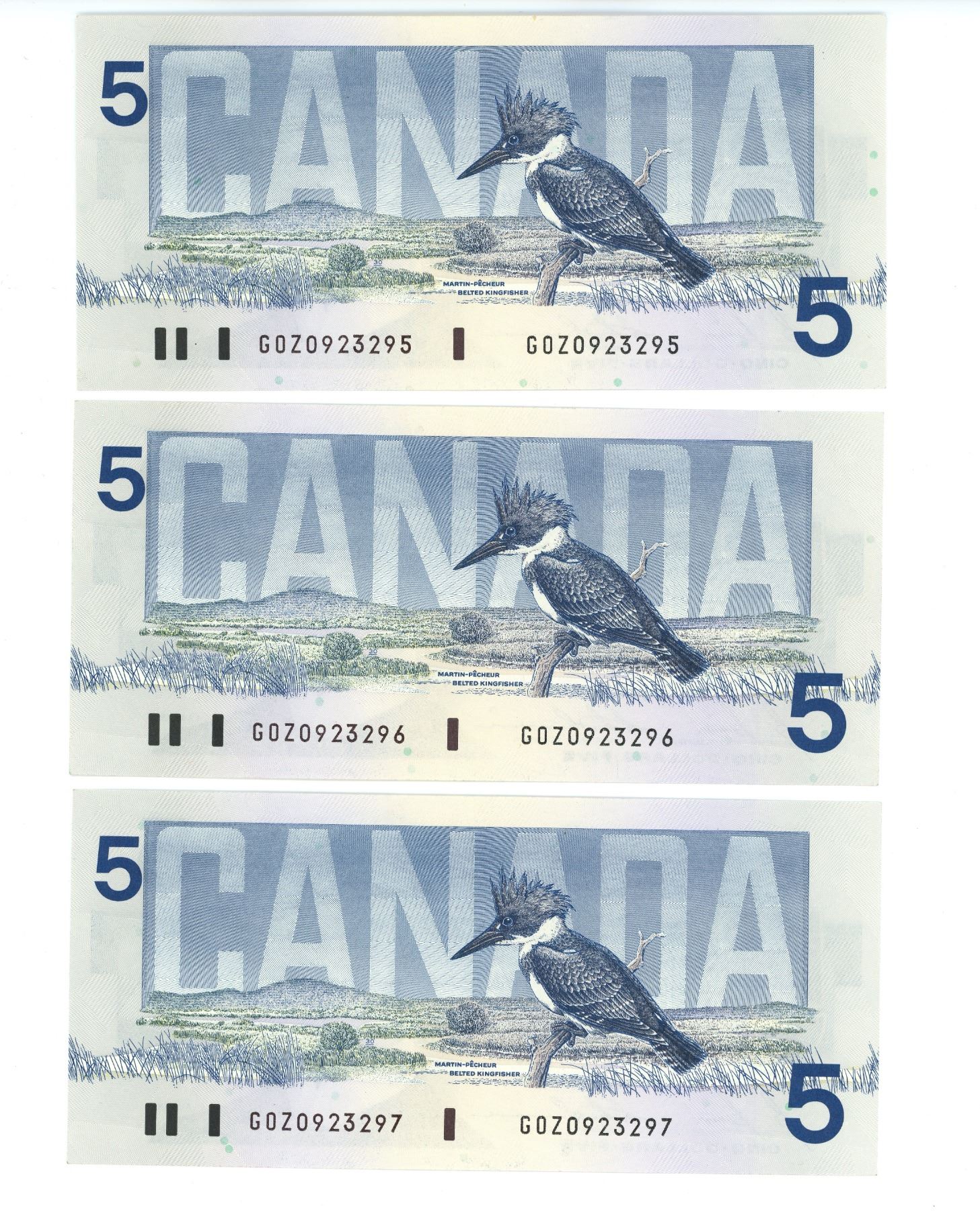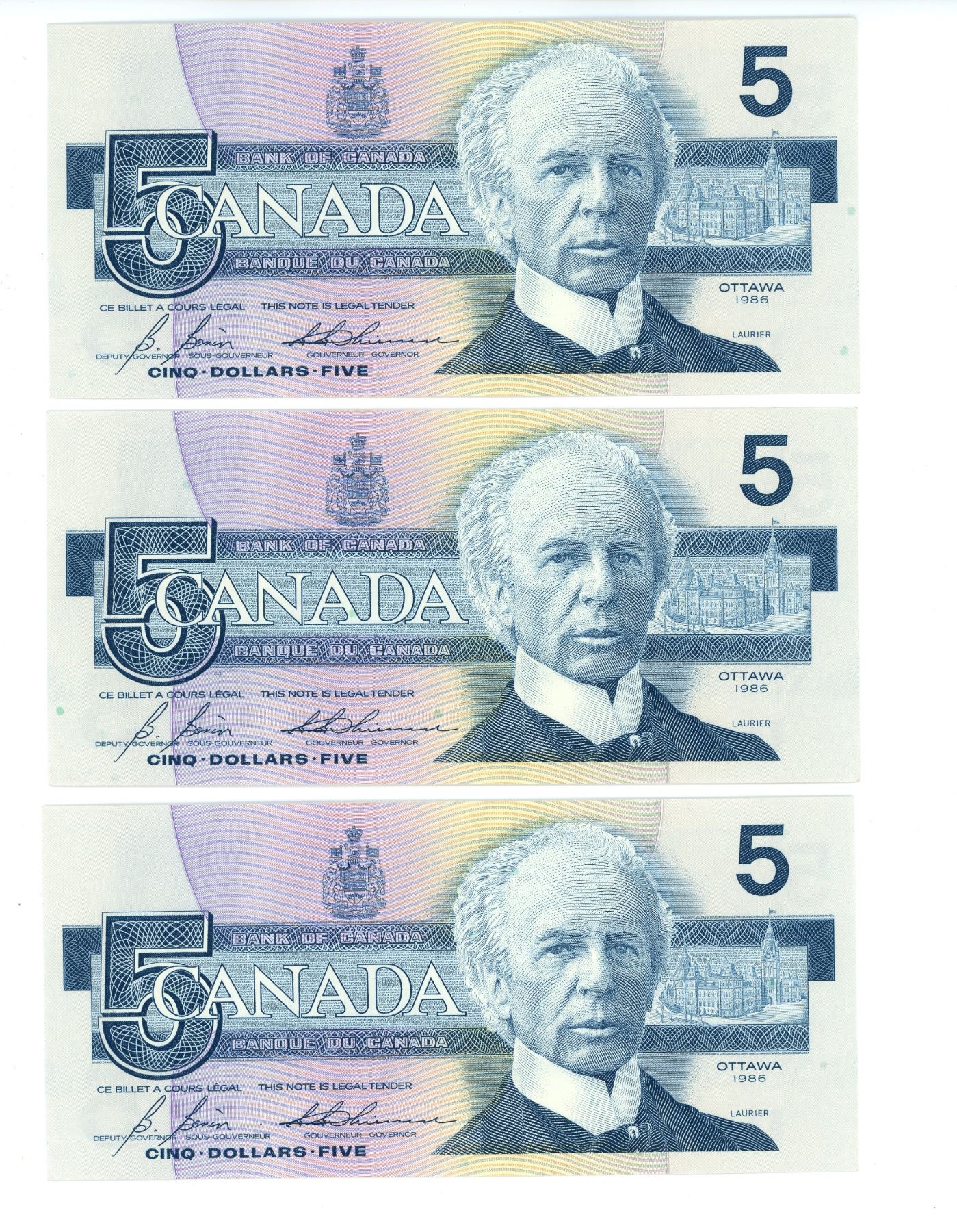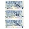 3 CDN 1986 $5 BILLS UNC + SEQUENTIAL