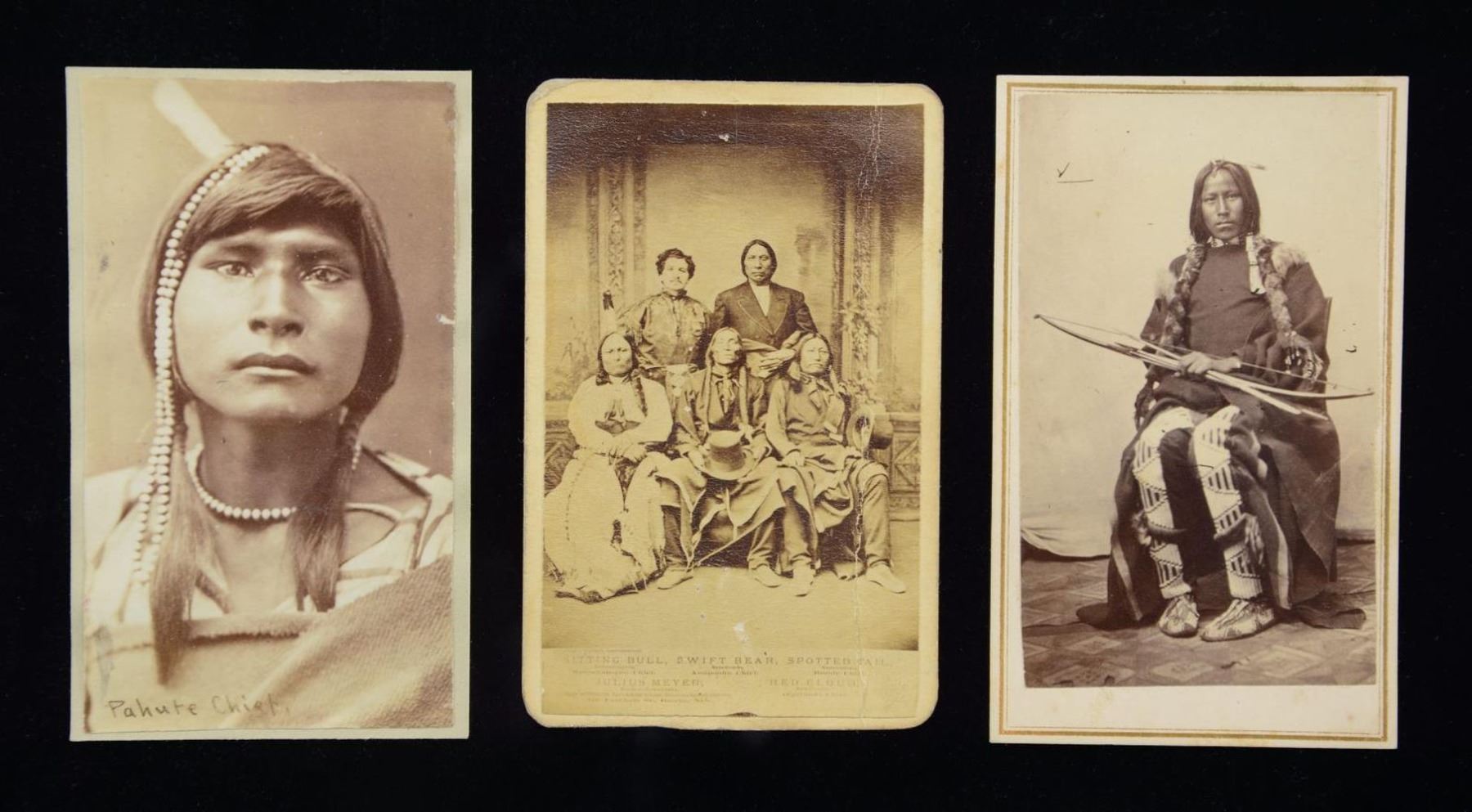 1) Unsigned image "Chief of Blackfeet Tribe" on verso in pencil. Seated view with bow and arrows, fully beaded leggings and moccasins, very good overall. 2) "Sitting Bull", "swift bear", "spotted tail", "Julius Meyer", and "Red Cloud", with imprint from larger photo at bottom of emulsion, good, crease & cracked right edge. 3) Slightly smaller photo mounted on paper "Pahute Chief" inked at bottom, very good. PROVENANCE: Martin Lane Historic & Western Americana Lifetime Collection. (02-21955/JS). $600-800.