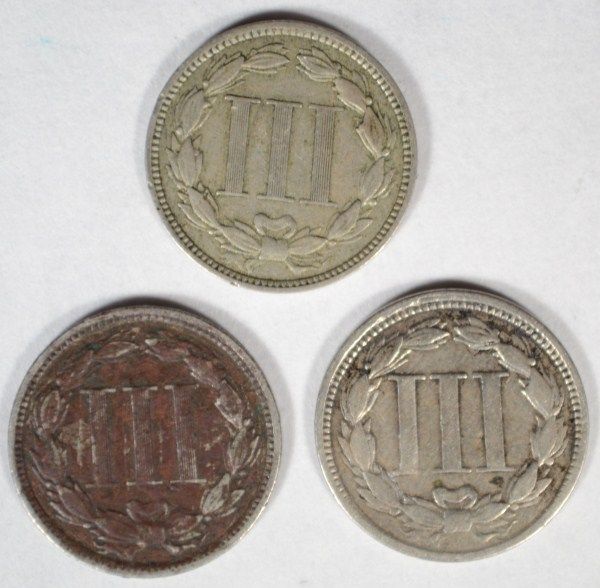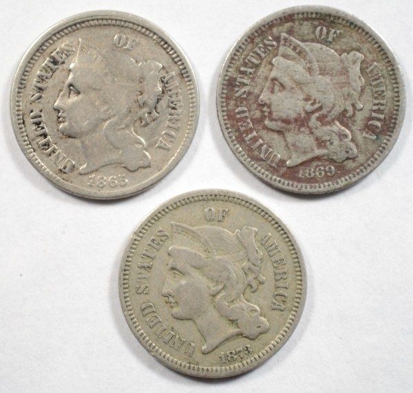 3 CENT NICKELS: 1865 F/VF, 1873 VF, 1869 VF/XF DARK