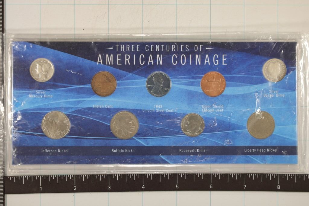CARDBOARD DISPLAY SEALED IN PLASTIC SLEEVE. INLCUDES 1898 INDIAN HEAD CENT, 1943 LINCOLN STEEL CENT, 2010-D LINCOLN CENT, 1908 LIBERTY "V" NICKEL, 1936 BUFFALO NICKEL, 2010-D JEFFERSON NICKEL, 1909 SILVER BARBER DIME,