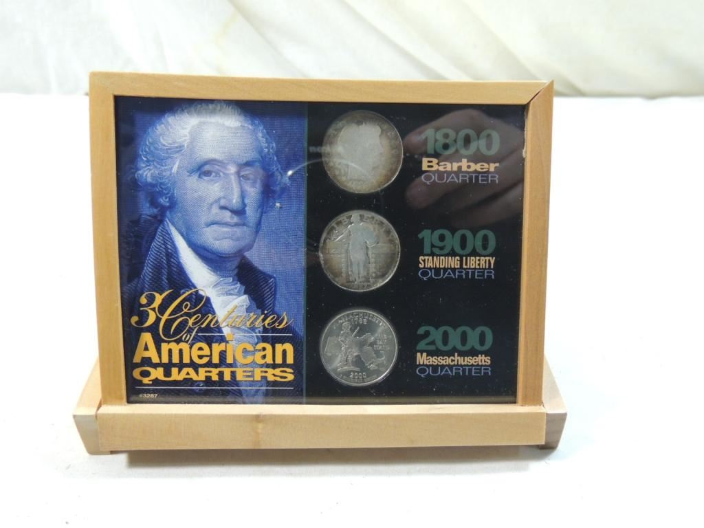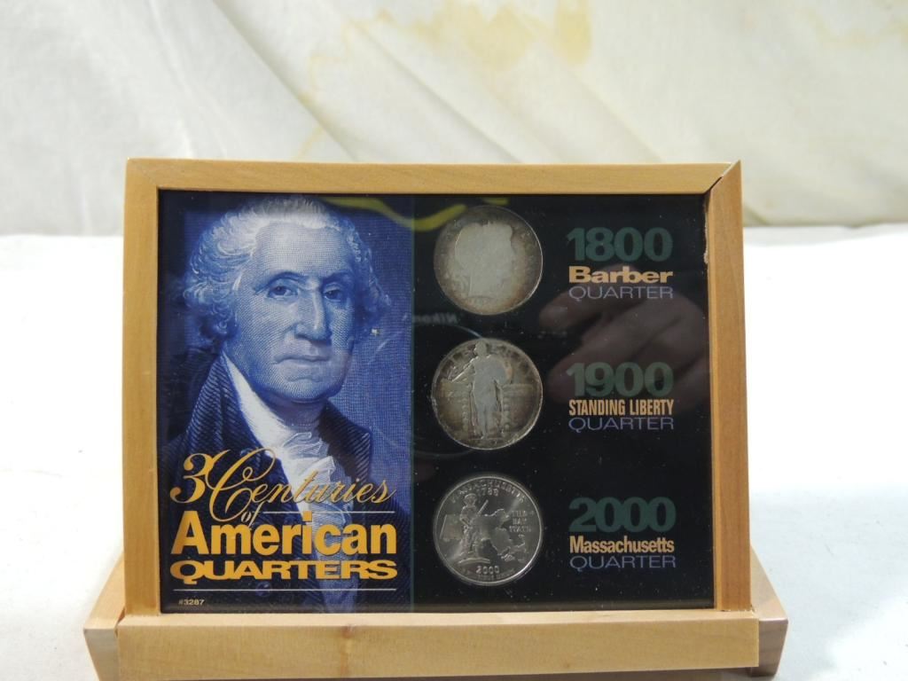 1800 BARBER QUARTER 1900 STANDING LIBERTY QUARTER 2000 MASSACHUSETTS QUARTER DISPLAY SET WOODEN DISPLAY COIN COLLECTIBLE AS SHOWN SEE PHOTO FOR MORE DETAILS.