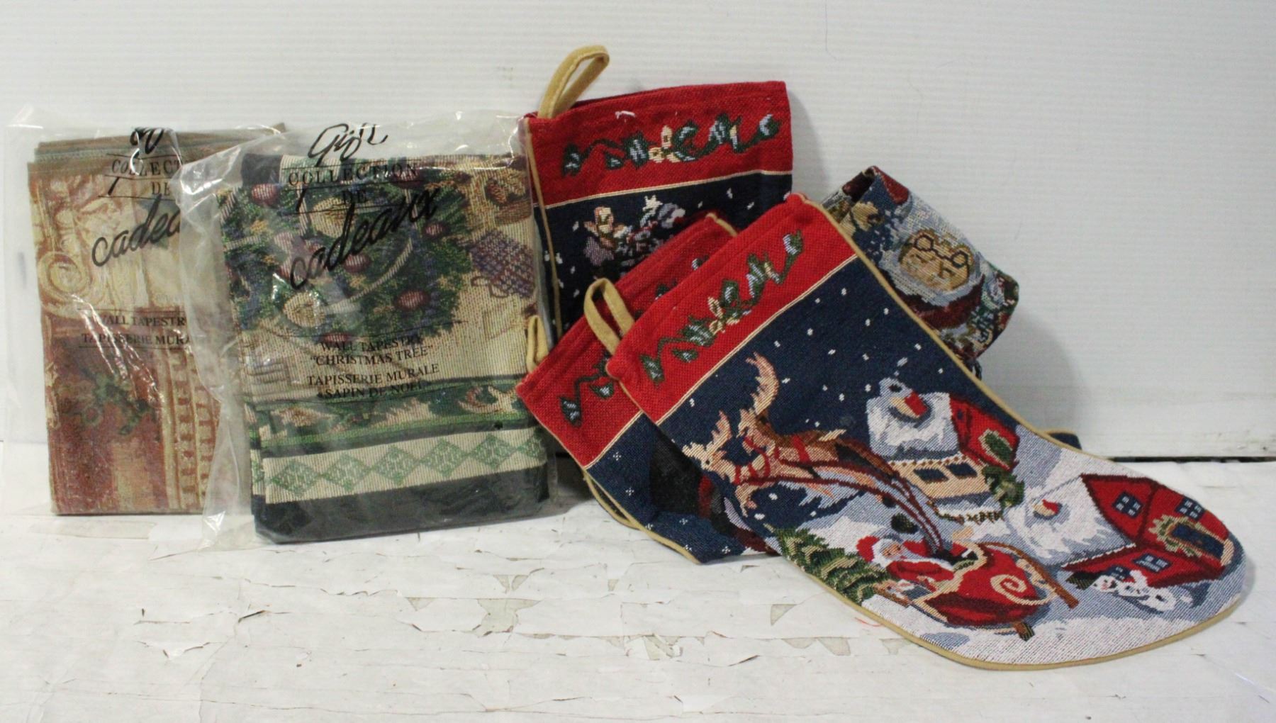 3 CHRISTMAS STOCKINGS & 2 WALL TAPESTRY