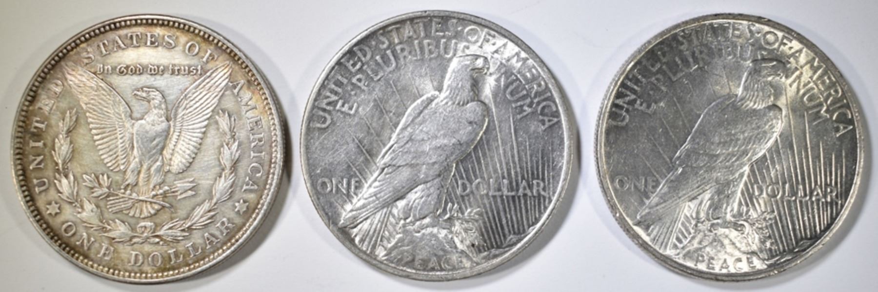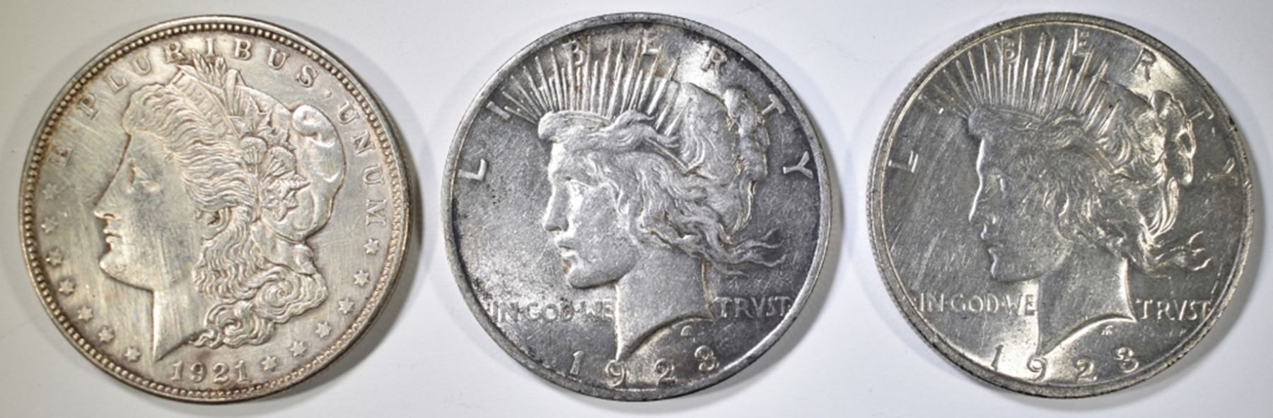 1921 MORGAN & 2-1923 PEACE DOLLARS ESTIMATE $100 - $125.