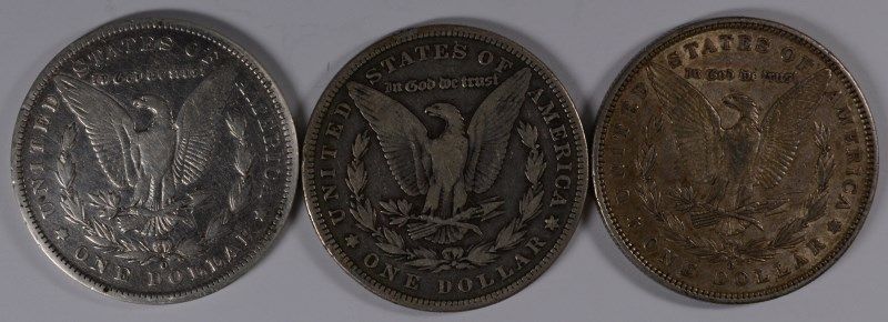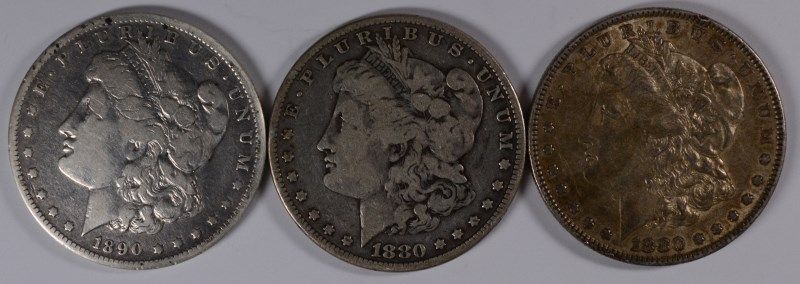3 CIRCULATED MORGAN DOLLARS 1880-P, O, 1890-O