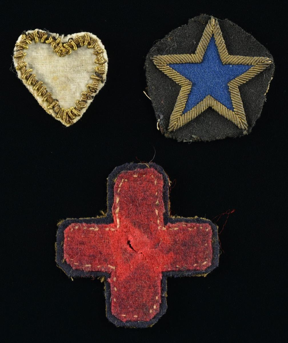 3) 24TH CORPS. A white wool 24th Corps badge with raised bullion border and a cotton gauze like backing. Badge is in the shape of a heart. CONDITION: overall general wear and minor staining. (02-17729/BF). $900-1,300.