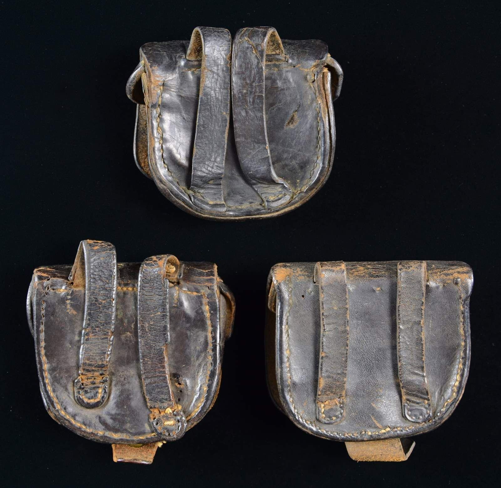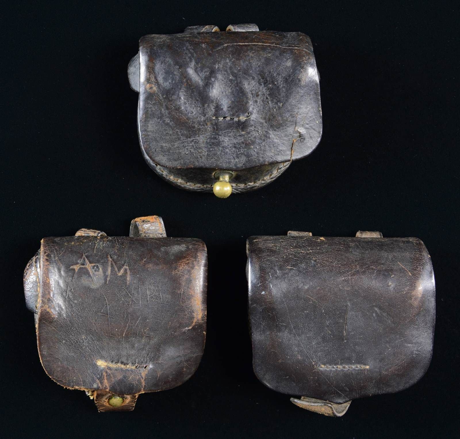 1) This cap box has no markings but does have an interior flap. The construction is sewn throughout with no rivets. The front flap has a “1” in the center. The finial is brass of a somewhat stubby form. The reverse shows 2 narrow, sewn belt loops. The closure tab has a single row of stitching. CONDITION: box shows light to moderate wear throughout. 2) This cap box has no markings but it does have an interior flap. The construction is quite crude and appears to be possibly pig skin. The construction is sewn throughout with no rivets. The front flap has several sets of initials carved into it, the most prominent of which is “AM”. The finial is brass of a shortened form. The reverse has 2 sewn belt loops, one of which had become detached and reconnected with a field repair. The closure tab has a single row of crude stitching. CONDITION: box shows moderate wear throughout with remnants of the interior wool. 3) This crudely made cap box has no markings but it does have an interior flap. The construction is crude and utilized bridle leather. The construction is sewn throughout with no rivets. The front flap is short and a bit square-ish. The finial is completely round. The reverse has 2 sewn belt loops. The closure tab is missing. CONDITION: box shows moderate wear throughout. Straps are complete. There is a small separation at the lower right, as viewed. (02-20130/BF). $500-800.