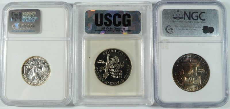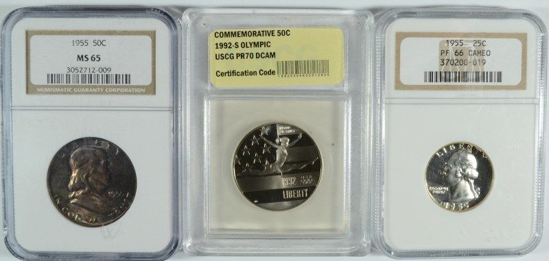 3 COINS: 1992-S OLYMPIC HALF DOLLAR PROOF, 1955 QUARTER NGC PF 66 CAMEO,