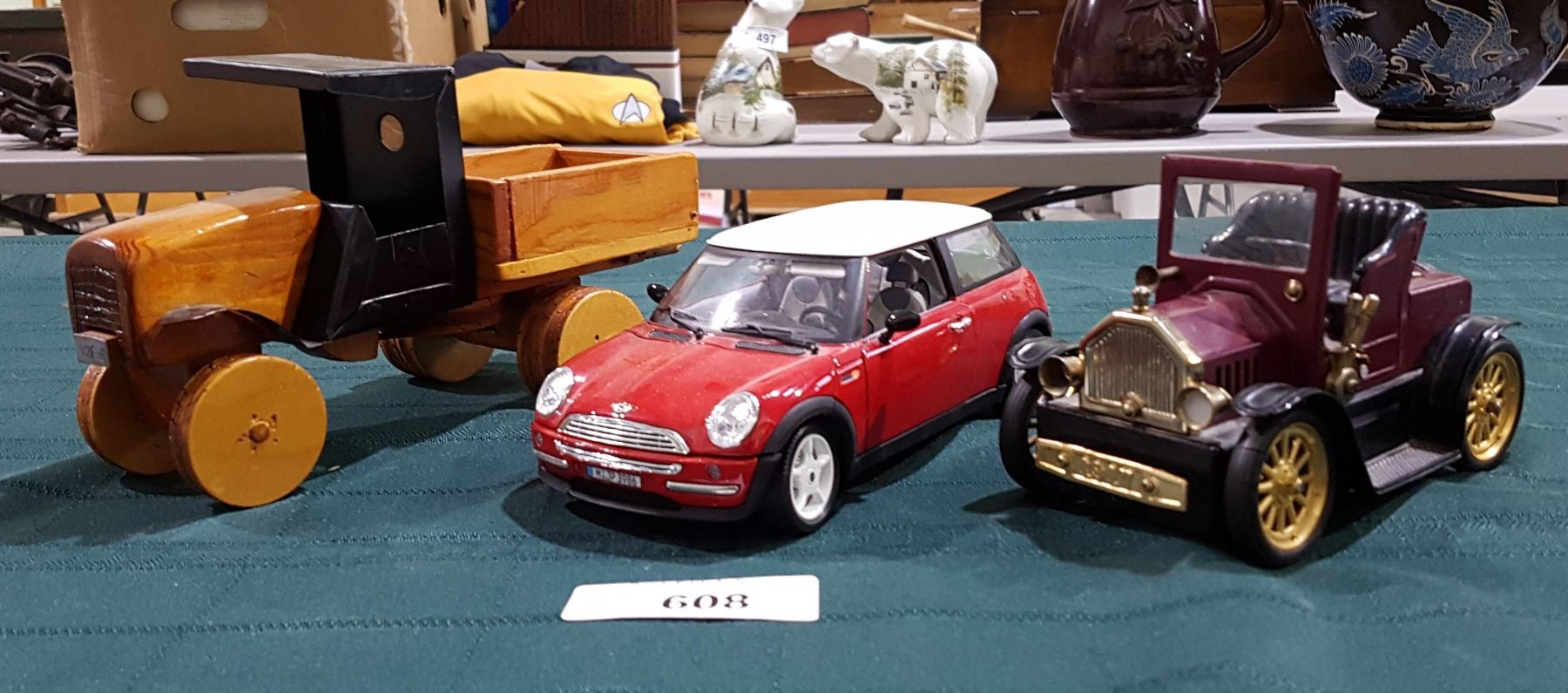 1:18 SCALE, MINI COOPER, HANDCRAFTED WOOD ANTIQUE FORD TRUCK & METAL 1917 CAR TABLE LIGHTER