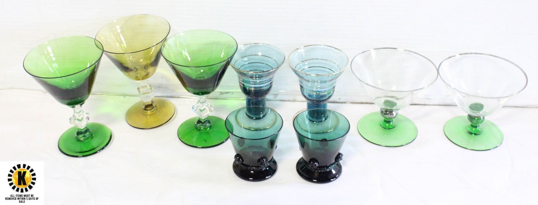 GLASSES WITH GREEN STEMS, 2 SMALL GREEN GLASSES, 2 BLUE GLASSES. WITH GOLD BANDING.