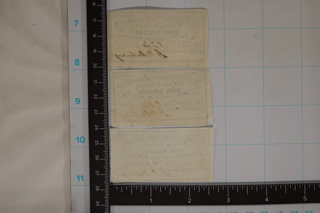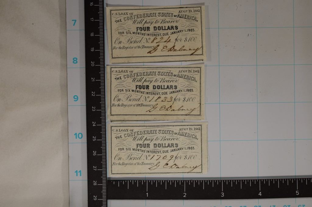 BOND COUPONS. EACH WILL PAY $4 INTEREST ON A DIFFERENT $100 BOND. BOND #824, BOND #833 AND BOND #1709. ALL HAND SIGNED AND NUMBERED