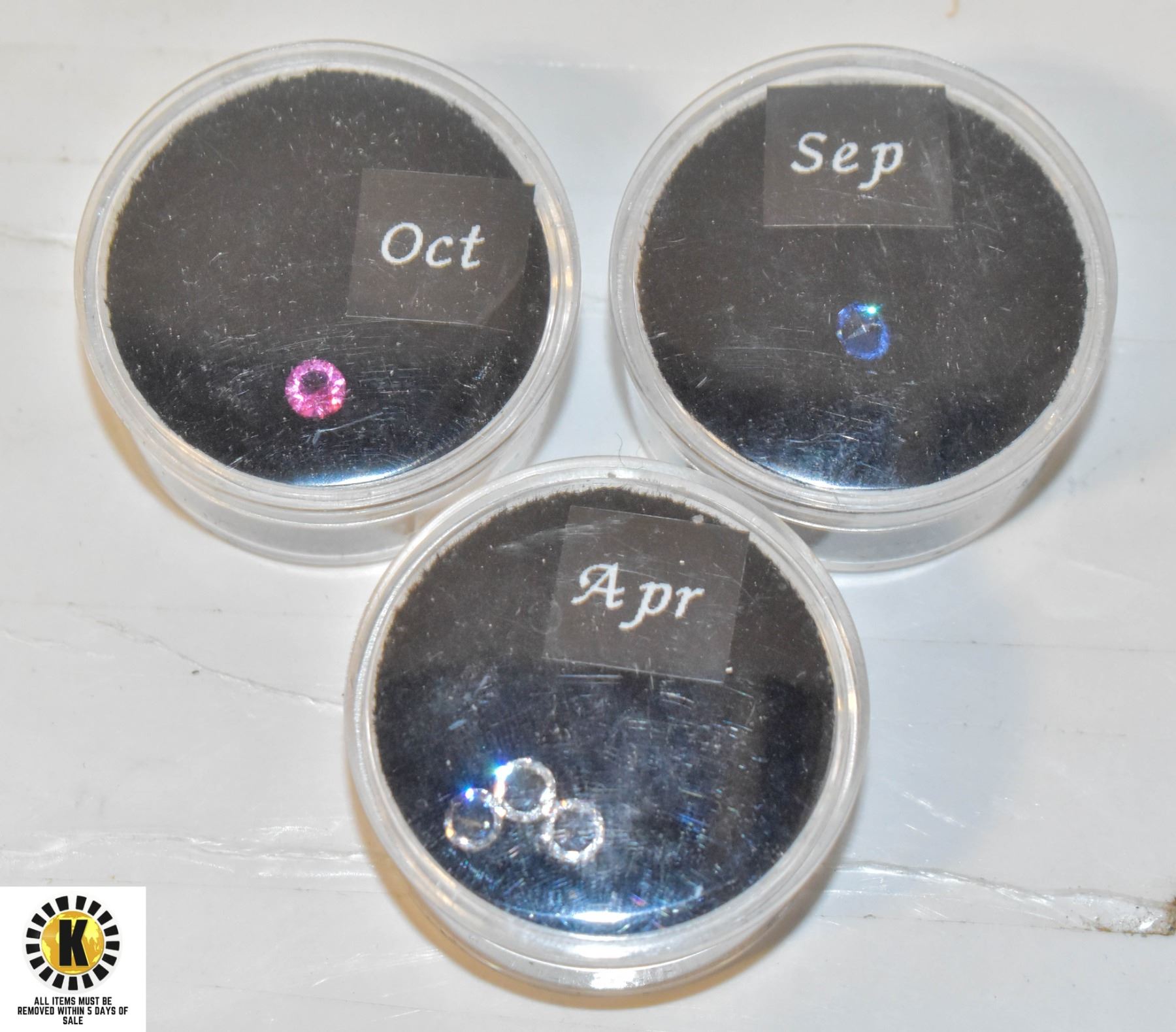 3 CONTAINERS WITH APRIL,SEPT & OCT GEMS IN