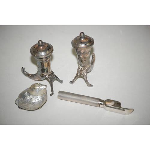 (3) CONTINENTAL SILVER SHAKERS & CORK SCREW - (1) 800<BR>SILVER BIRD FORM SHAKER, (2) SWEDISH STERLING HORN<BR>FORM SHAKERS & (1) 900 SILVER BOTTLE OPENER & CORK<BR>SCREW-MARKED GES GESCH - MINOR WEAR & IMPERFECTIONS