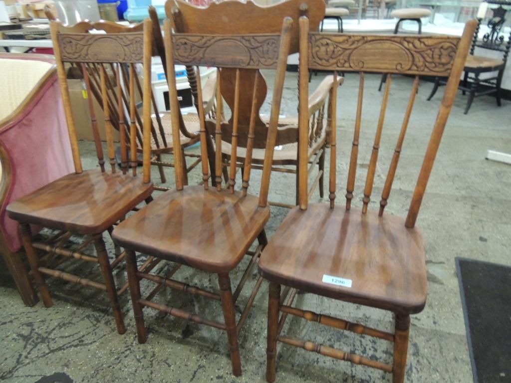 MATCHING COUNTRY DINNING CHAIRS WITH CARVED DETAILS. AS SHOWN. SEE PHOTO FOR MORE DETAILS.