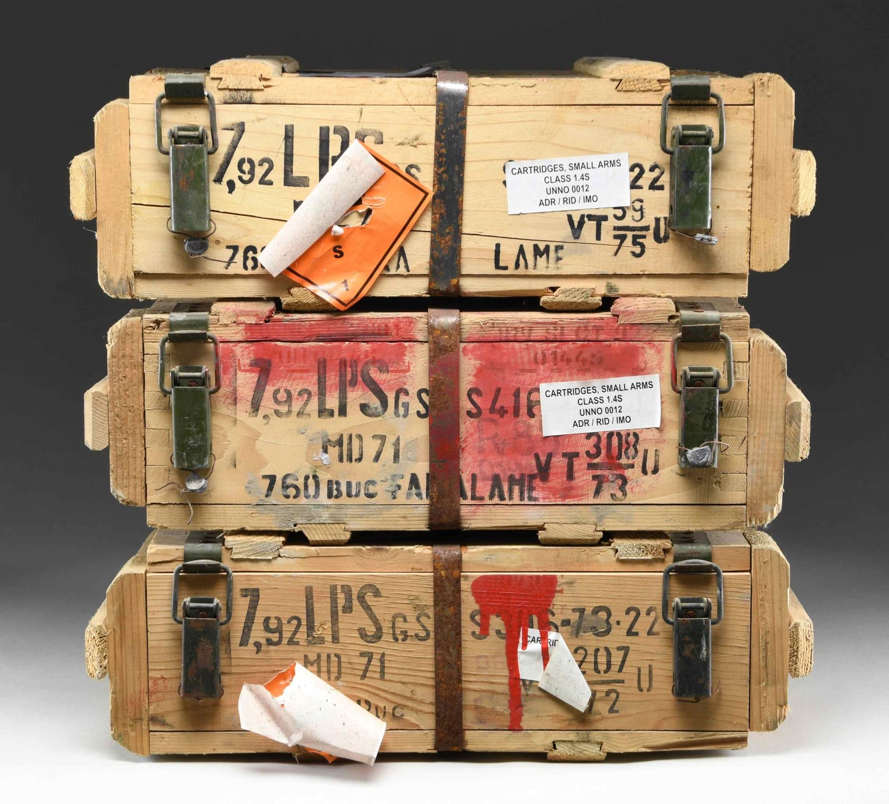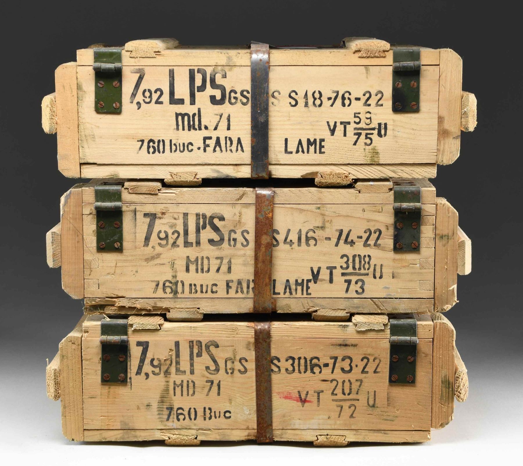 Group contains 3 sealed wooden crates of 760 rds each, totaling approx. 2,280 rds. 7.92 Mauser ammunition mfg. in Romania in the 1970s. Crate markings include "7.92", the marking "LPS" which indicates light ball w/ mild steel core bullet type, "GS" which means a lacquered steel cartridge case. Hinged wooden crates w/ over-center latches are sealed by steel strapping. CONDITION: ammunition not inspected due to the sealed crates. Crates have normal handling wear, scuffing & staining. PROVENANCE: From the Estate of Ivan Lee Shapiro. (02-23495-2/RW). AMMO. $600-900.
