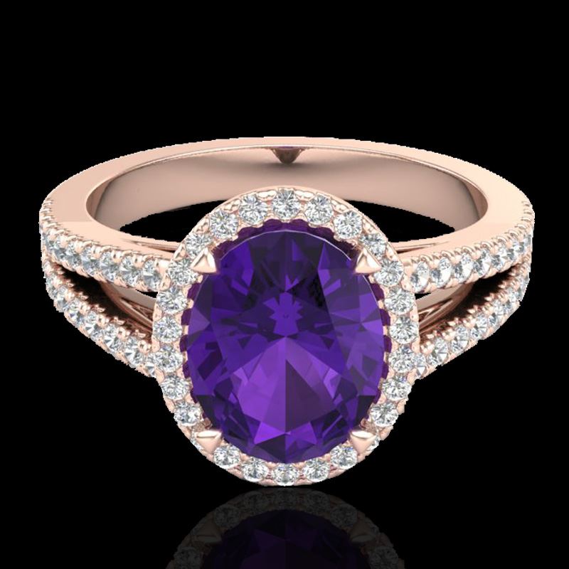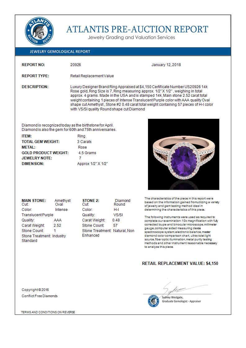REF-58A2X -20926 ---- 3 CTW Amethyst & Micro VS/SI Diamond Halo Solitaire Ring 14K Rose Gold ---- Luxury Designer Brand Ring Appraised at $4,150 Certificate Number US20926 14k Rose gold, Ring Size is 7, Ring measuring approx. 1/2" X 1/2" , weighing in total approx. 4 grams. Made in the USA and is stamped 14k, Main stone 2.52 carat total weight containing 1 pieces of Intense Translucent Purple color with AAA quality Oval shape cut Amethyst , Stone #2 0.48 carat total weight containing 57 pieces of H-I color with VS/SI quality Round shape cut Diamond