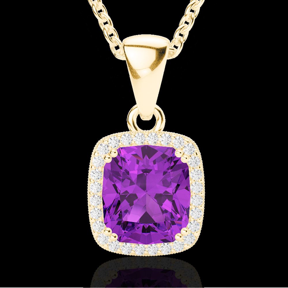 REF-48W9F -22817 ---- 3 CTW Amethyst & Micro VS/SI Diamond Pave Halo Necklace 18K Yellow Gold ---- Luxury Designer Brand Necklace Appraised at $3,500 Certificate Number US22817 18k Yellow gold, Necklace Size is 16 Inches, Necklace measuring approx. 7/16" x 7/16" , weighing in total approx. 3.8 grams. Made in the USA and is stamped 18k, Main stone 2.78 carat total weight containing 1 pieces of Intense Translucent Purple color with AAA quality Cushion shape cut Amethyst , Stone #2 0.22 carat total weight containing 28 pieces of H-I color with VS/SI quality Round shape cut Diamond