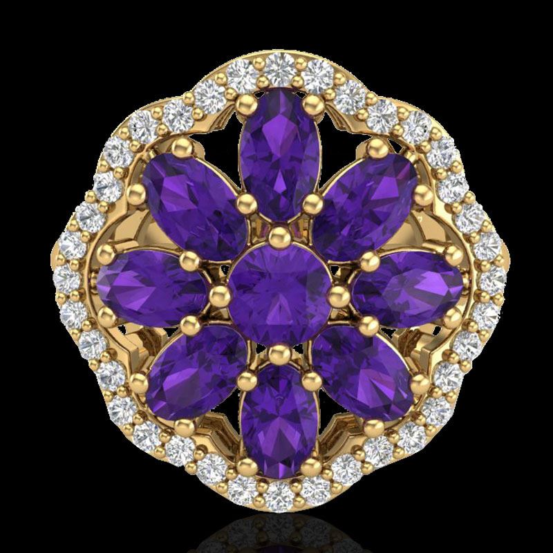 REF-52F2N -20772 ---- 3 CTW Amethyst & VS/SI Diamond Cluster Designer Halo Ring 10K Yellow Gold ---- Luxury Designer Brand Ring Appraised at $3,750 Certificate Number US20772 10k Yellow gold, Ring Size is 7, Ring measuring approx. 7/8"X3/4" , weighing in total approx. 4.5 grams. Made in the USA and is stamped 10k, Main stone 2.35 carat total weight containing 8 pieces of Intense Translucent Purple color with AAA quality Oval shape cut Amethyst , Stone #2 0.15 carat total weight containing 1 pieces of Intense Translucent Purple color with AAA quality Round shape cut Amethyst , Stone #3 0.5 carat total weight containing 33 pieces of G-H color with VS/SI quality Round shape cut Diamond