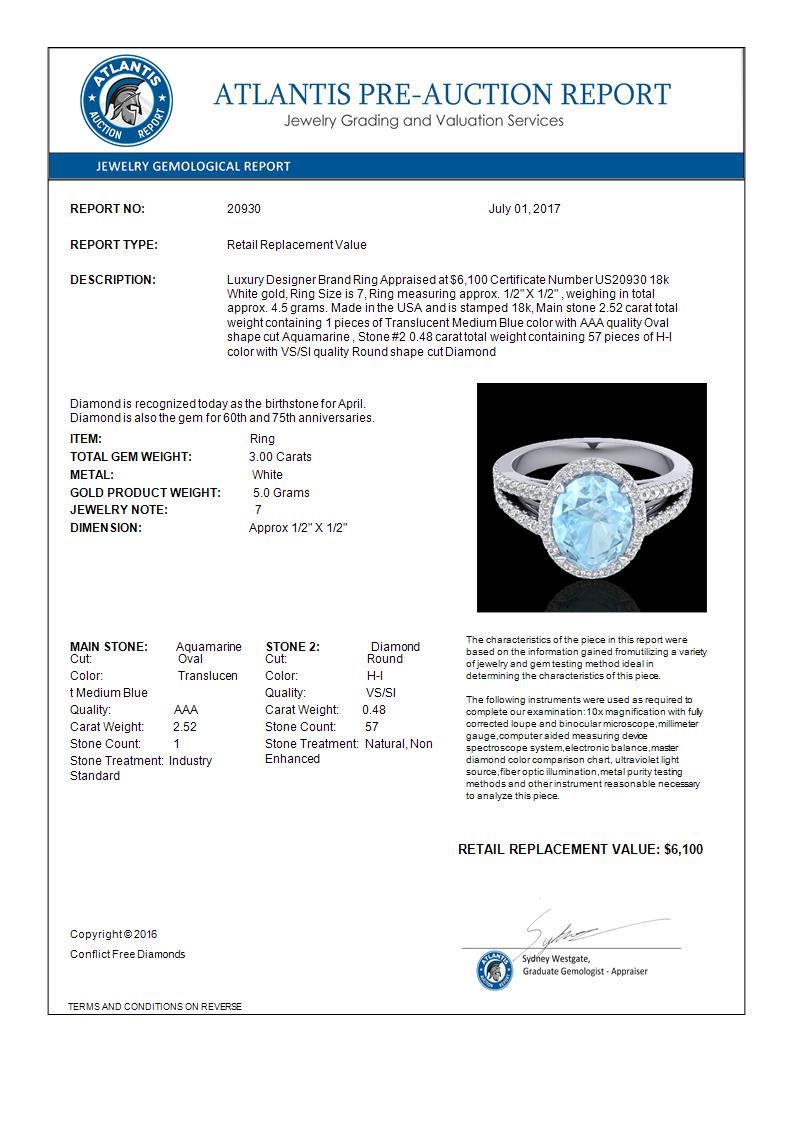 3 CTW Aquamarine & Micro VS/SI Diamond Halo Solitaire Ring 18K White Gold ---- Luxury Designer Brand Ring Appraised Retail Price at $6,100 ---- SKU Number US20930 18k White gold Ring Size is 7, Ring measuring approx. 1/2" X 1/2" , weighing in total approx. 4.5 grams. Made in the USA and is stamped 18k, Main stone 2.52 carat total weight containing 1 pieces of Translucent Medium Blue color with AAA quality Oval shape cut Aquamarine , Stone #2 0.48 carat total weight containing 57 pieces of H-I color with VS/SI quality Round shape cut
