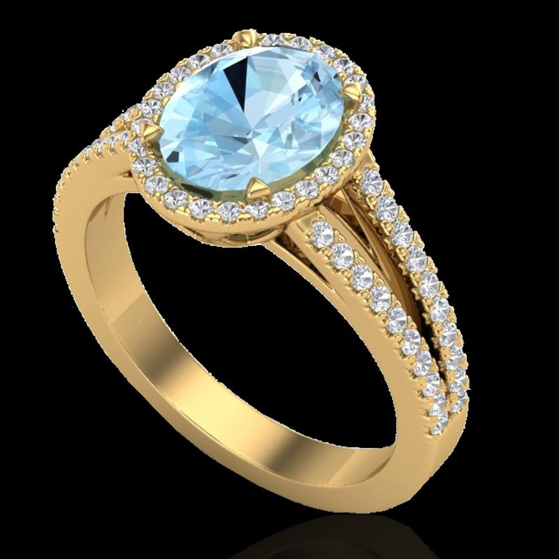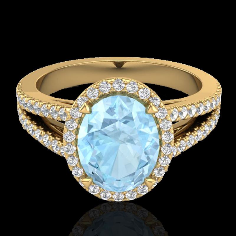 REF-85A5X -20931 ---- 3 CTW Aquamarine & Micro VS/SI Diamond Halo Solitaire Ring 18K Yellow Gold ---- Luxury Designer Brand Ring Appraised at $6,100 Certificate Number US20931 18k Yellow gold, Ring Size is 7, Ring measuring approx. 1/2" X 1/2" , weighing in total approx. 4.5 grams. Made in the USA and is stamped 18k, Main stone 2.52 carat total weight containing 1 pieces of Translucent Medium Blue color with AAA quality Oval shape cut Aquamarine , Stone #2 0.48 carat total weight containing 57 pieces of H-I color with VS/SI quality Round shape cut Diamond