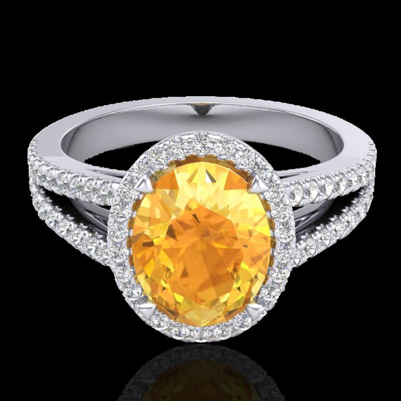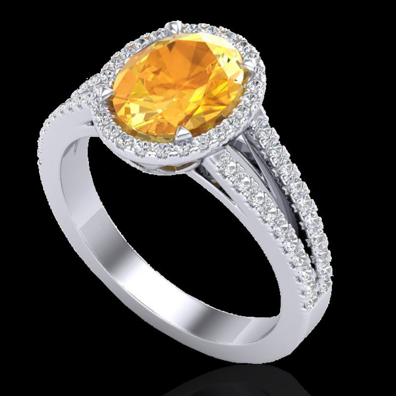 REF-70H9A -20936 ---- 3 CTW Citrine & Micro VS/SI Diamond Halo Solitaire Ring 18K White Gold ---- Luxury Designer Brand Ring Appraised at $4,700 Certificate Number US20936 18k White gold, Ring Size is 7, Ring measuring approx. 1/2" X 1/2" , weighing in total approx. 4.5 grams. Made in the USA and is stamped 18k, Main stone 2.52 carat total weight containing 1 pieces of Translucent Yellow color with AAA quality Oval shape cut Citrine , Stone #2 0.48 carat total weight containing 57 pieces of H-I color with VS/SI quality Round shape cut Diamond