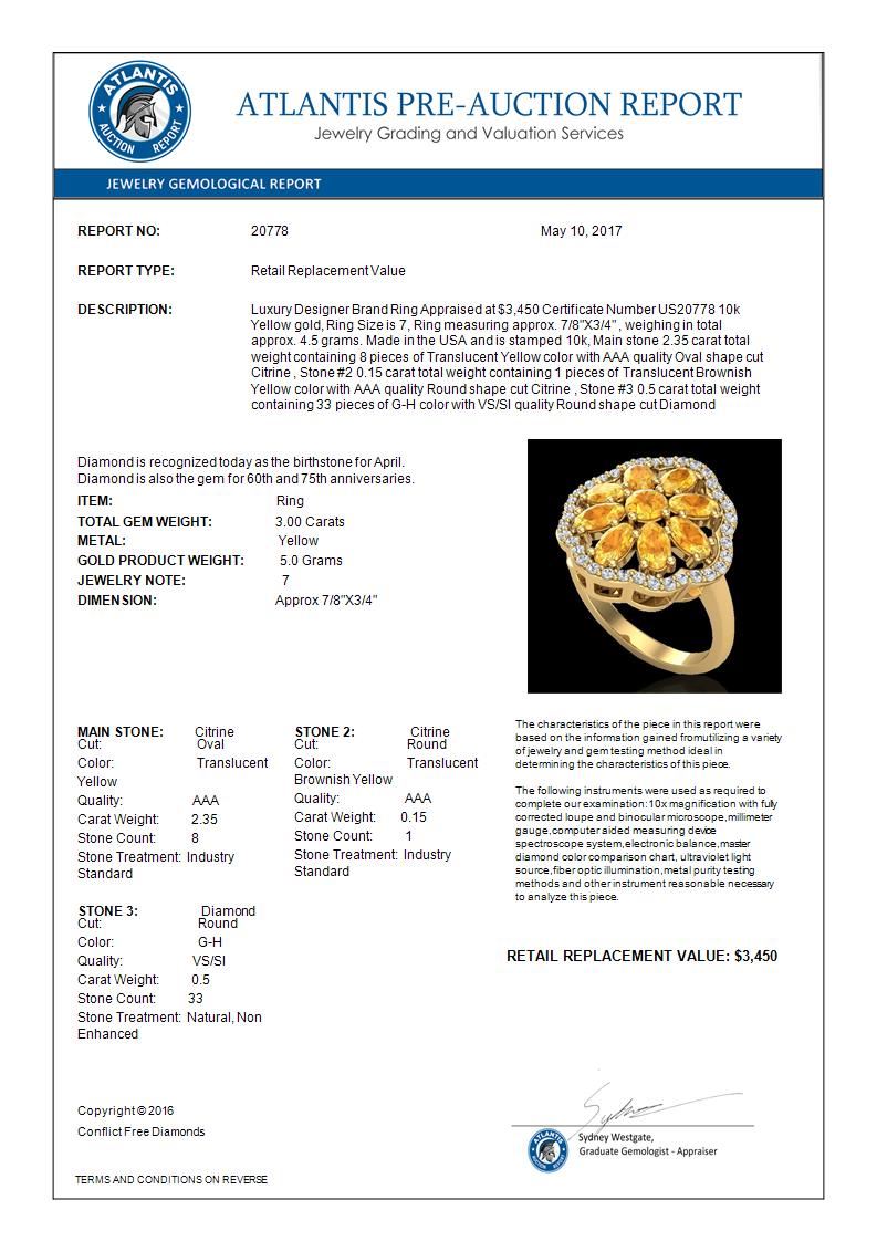 3 CTW Citrine & VS/SI Diamond Cluster Designer Halo Ring 10K Yellow Gold ---- Luxury Designer Brand Ring Appraised Retail Price at $3,450 ---- SKU Number US20778 10k Yellow gold Ring Size is 7, Ring measuring approx. 7/8"X3/4" , weighing in total approx. 4.5 grams. Made in the USA and is stamped 10k, Main stone 2.35 carat total weight containing 8 pieces of Translucent Yellow color with AAA quality Oval shape cut Citrine , Stone #2 0.15 carat total weight containing 1 pieces of Translucent Brownish Yellow color with AAA quality Round shape cut