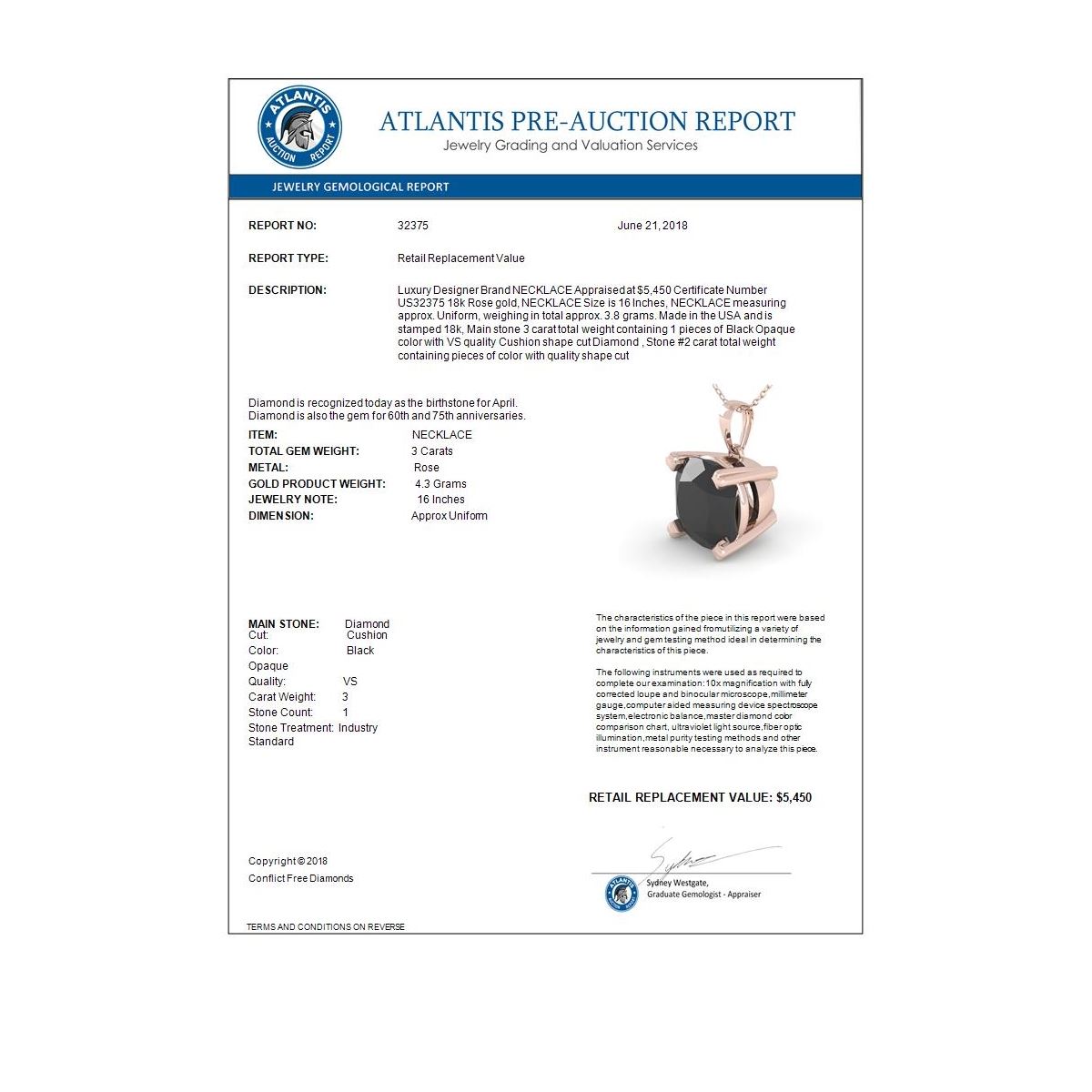 REF-89W8F -32375 ---- 3 CTW Cushion Black Diamond Designer Necklace 18K Rose Gold ---- Luxury Designer Brand NECKLACE Appraised at $5,450 Certificate Number US32375 18k Rose gold, NECKLACE Size is 16 Inches, NECKLACE measuring approx. Uniform, weighing in total approx. 3.8 grams. Made in the USA and is stamped 18k, Main stone 3 carat total weight containing 1 pieces of Black Opaque color with VS quality Cushion shape cut Diamond , Stone #2 carat total weight containing pieces of color with quality shape cut