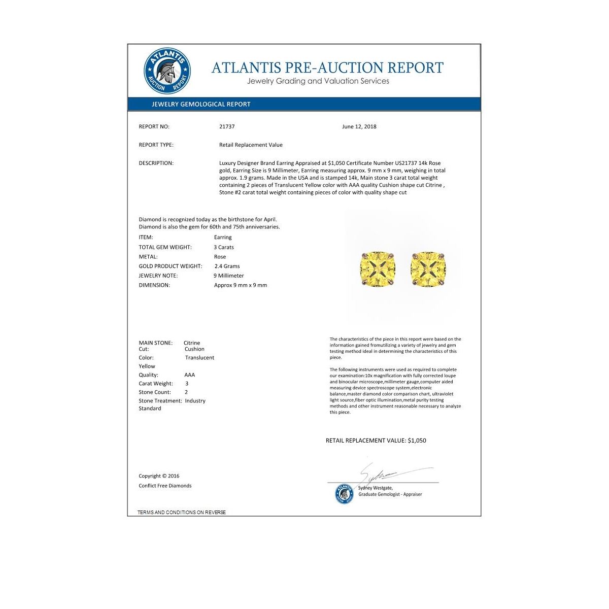 REF-17H3A -21737 ---- 3 CTW Cushion Cut Citrine Designer Solitaire Stud Earrings 14K Rose Gold ---- Luxury Designer Brand Earring Appraised at $1,050 Certificate Number US21737 14k Rose gold, Earring Size is 9 Millimeter, Earring measuring approx. 9 mm x 9 mm, weighing in total approx. 1.9 grams. Made in the USA and is stamped 14k, Main stone 3 carat total weight containing 2 pieces of Translucent Yellow color with AAA quality Cushion shape cut Citrine , Stone #2 carat total weight containing pieces of color with quality shape cut