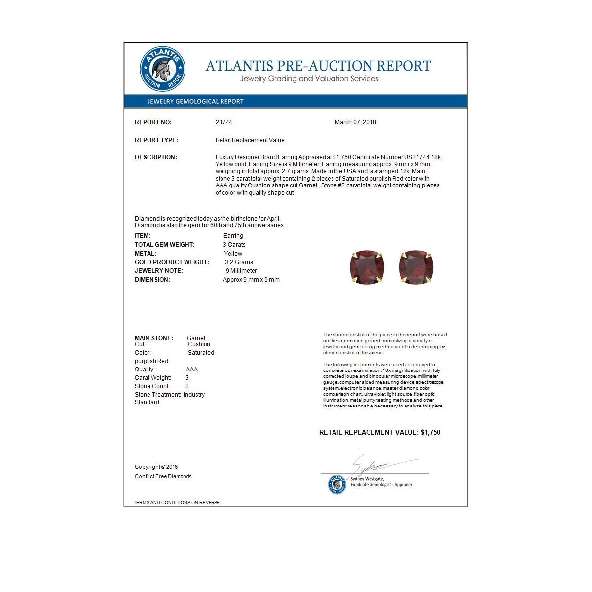 REF-29Y3K -21744 ---- 3 CTW Cushion Cut Garnet Designer Solitaire Stud Earrings 18K Yellow Gold ---- Luxury Designer Brand Earring Appraised at $1,750 Certificate Number US21744 18k Yellow gold, Earring Size is 9 Millimeter, Earring measuring approx. 9 mm x 9 mm, weighing in total approx. 2.7 grams. Made in the USA and is stamped 18k, Main stone 3 carat total weight containing 2 pieces of Saturated purplish Red color with AAA quality Cushion shape cut Garnet , Stone #2 carat total weight containing pieces of color with quality shape cut