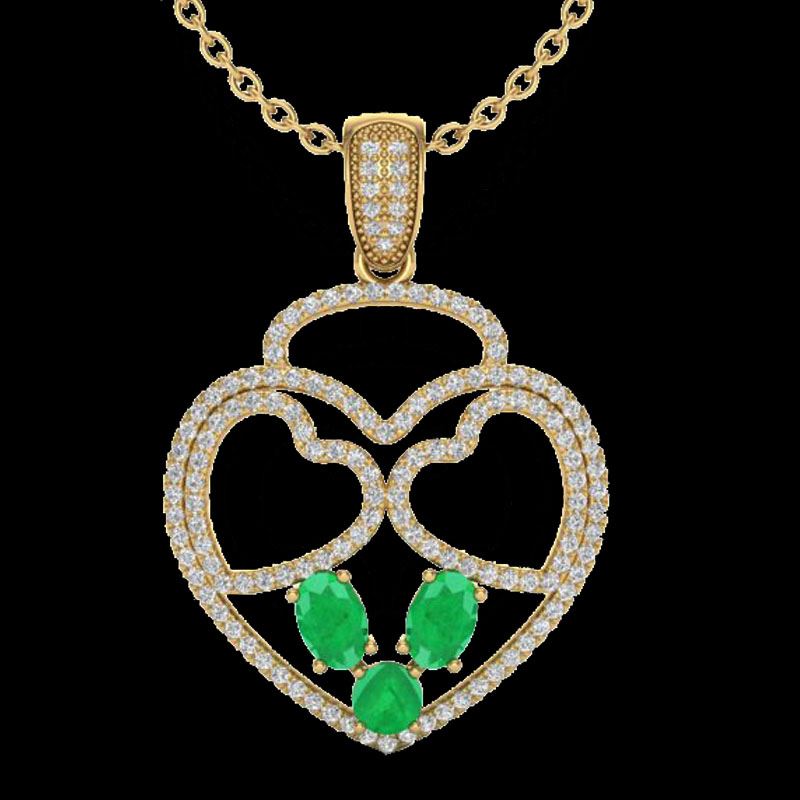 REF-117M8H -22540 ---- 3 CTW Emerald & Micro Pave Designer Inspired Heart Necklace 14K Yellow Gold ---- Luxury Designer Brand Necklace Appraised at $8,400 Certificate Number US22540  14k Yellow gold,  Necklace Size is 16 Inches, Necklace measuring approx. 1 1/2" x 1" , weighing in total approx. 7.3 grams. Made in the USA and is stamped 14k, Main stone 1.5 carat total weight containing 2 pieces of Intense Green color with AAA quality Oval shape cut Emerald , Stone #2 0.3 carat total weight containing 1 pieces of Intense Green color with  Mid-Opaque quality Round shape cut Emerald , Stone #3 1.2 carat total weight containing 160 pieces of G-H color with VS/SI quality  Round shape cut Diamond