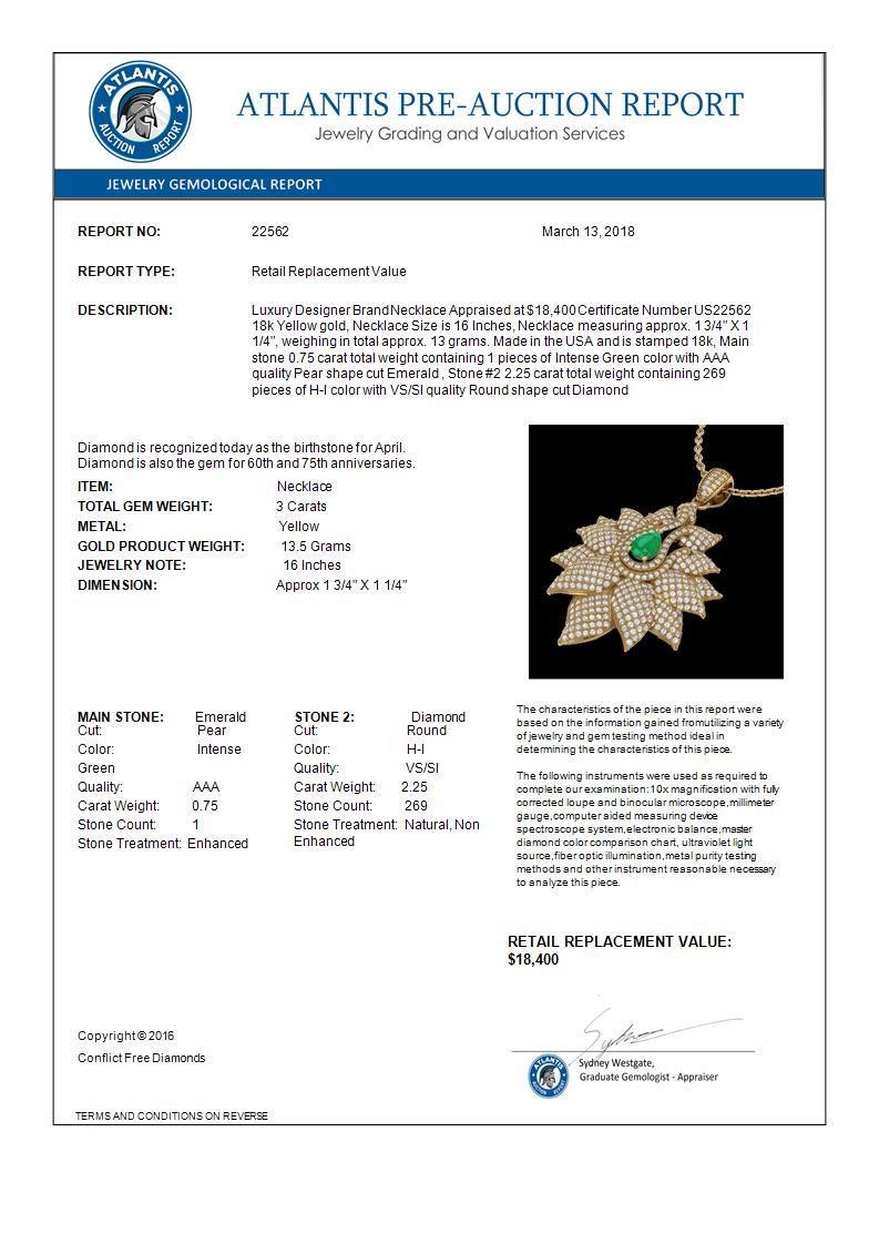 REF-257Y3K -22562 ---- 3 CTW Emerald & Micro VS/SI Diamond Designer Necklace 18K Yellow Gold ---- Luxury Designer Brand Necklace Appraised at $18,400 Certificate Number US22562 18k Yellow gold, Necklace Size is 16 Inches, Necklace measuring approx. 1 3/4" X 1 1/4", weighing in total approx. 13 grams. Made in the USA and is stamped 18k, Main stone 0.75 carat total weight containing 1 pieces of Intense Green color with AAA quality Pear shape cut Emerald , Stone #2 2.25 carat total weight containing 269 pieces of H-I color with VS/SI quality Round shape cut Diamond