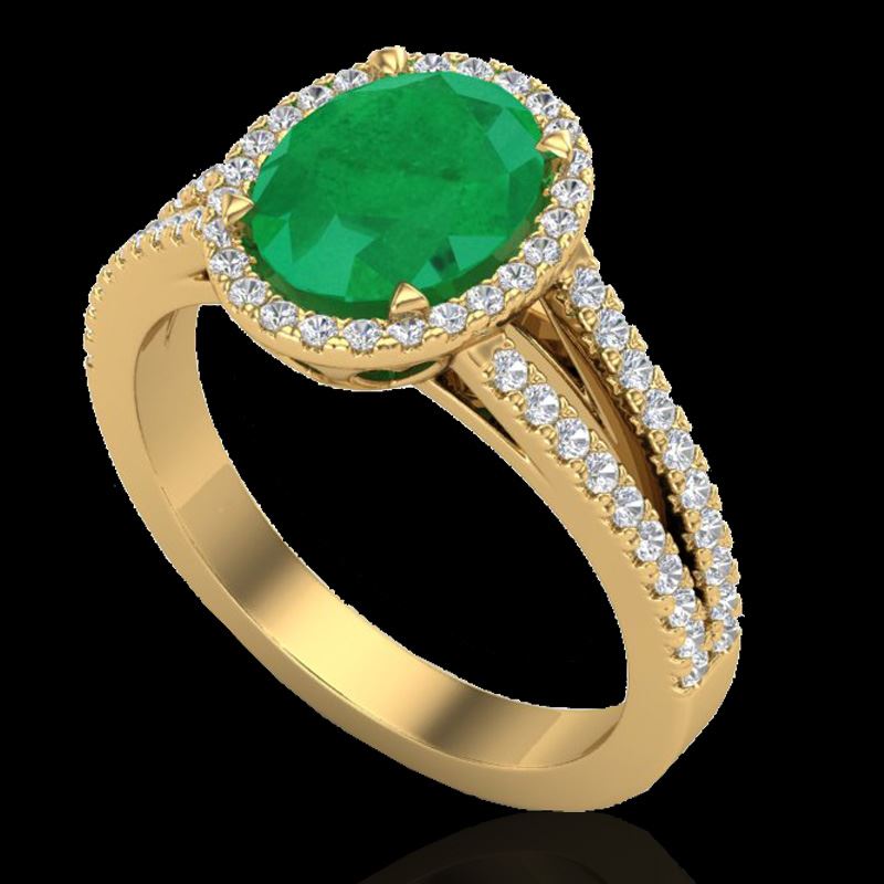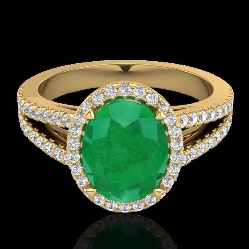REF-83H6A -20939 ---- 3 CTW Emerald & Micro VS/SI Diamond Halo Solitaire Ring 18K Yellow Gold ---- Luxury Designer Brand Ring Appraised at $5,500 Certificate Number US20939 18k Yellow gold, Ring Size is 7, Ring measuring approx. 1/2" X 1/2" , weighing in total approx. 4.5 grams. Made in the USA and is stamped 18k, Main stone 2.52 carat total weight containing 1 pieces of Intense Green color with AAA quality Oval shape cut Emerald , Stone #2 0.48 carat total weight containing 57 pieces of H-I color with VS/SI quality Round shape cut Diamond