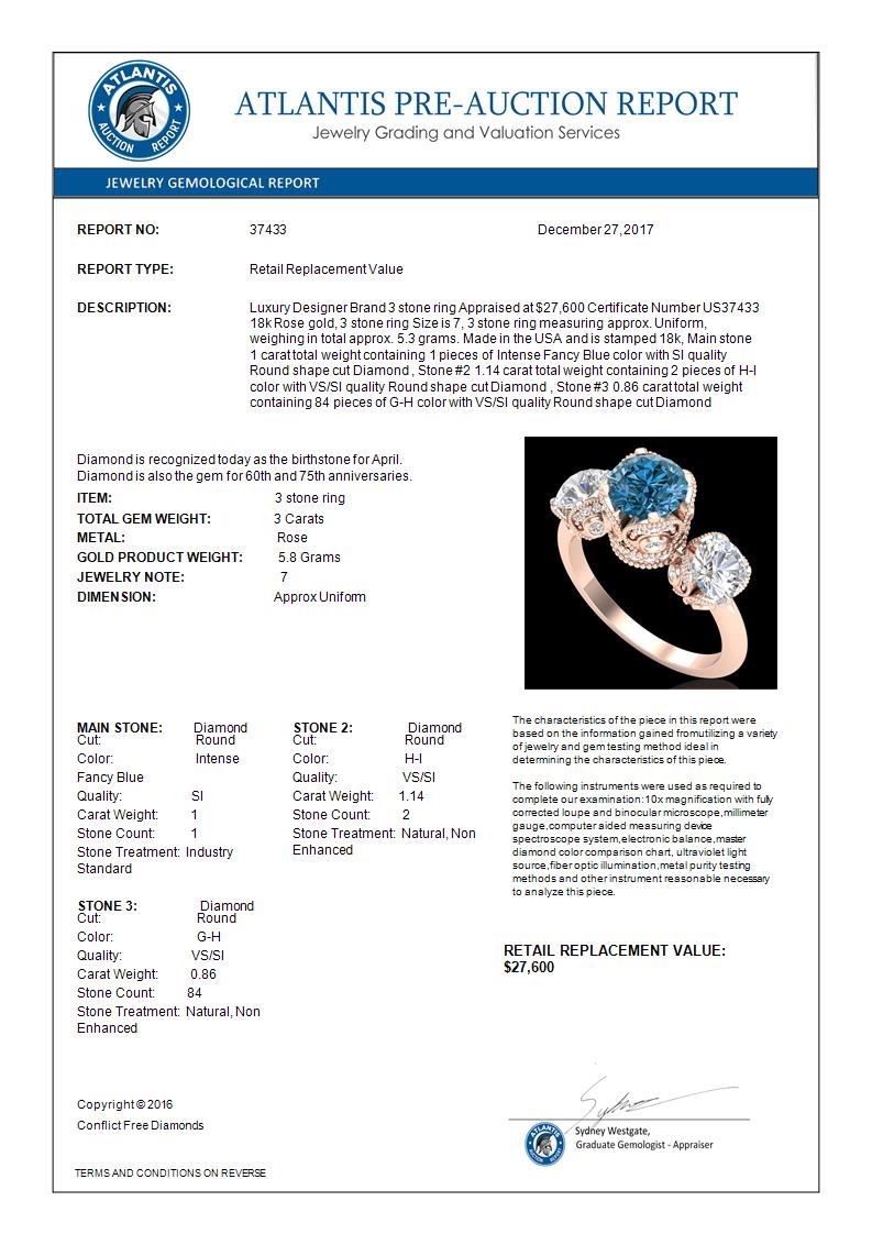 REF-418N2Y -37433 ---- 3 CTW Fancy Intense Blue Diamond Solitaire Art Deco 3 Stone Ring 18K Rose Gold ---- Luxury Designer Brand 3 stone ring Appraised at $27,600 Certificate Number US37433 18k Rose gold, 3 stone ring Size is 7, 3 stone ring measuring approx. Uniform, weighing in total approx. 5.3 grams. Made in the USA and is stamped 18k, Main stone 1 carat total weight containing 1 pieces of Intense Fancy Blue color with SI quality Round shape cut Diamond , Stone #2 1.14 carat total weight containing 2 pieces of H-I color with VS/SI quality Round shape cut Diamond , Stone #3 0.86 carat total weight containing 84 pieces of G-H color with VS/SI quality Round shape cut Diamond