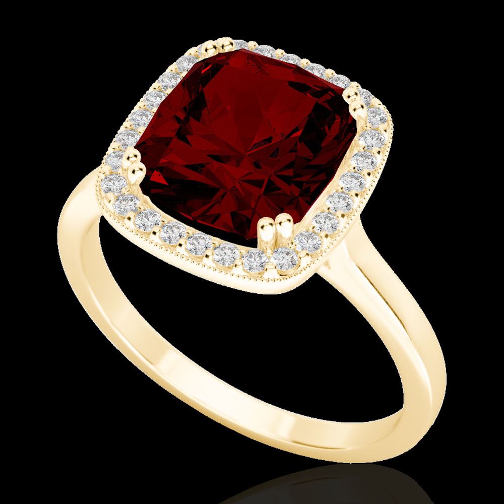 REF-48W5F -22845 ---- 3 CTW Garnet & Micro Pave VS/SI Diamond Halo Ring 18K Yellow Gold ---- Luxury Designer Brand Ring Appraised at $3,200 Certificate Number US22845 18k Yellow gold, Ring Size is 6.5, Ring measuring approx. 7/16" x 7/16" , weighing in total approx. 4.1 grams. Made in the USA and is stamped 18k, Main stone 2.78 carat total weight containing 1 pieces of Saturated purplish Red color with AAA quality Cushion shape cut Garnet , Stone #2 0.22 carat total weight containing 28 pieces of H-I color with VS/SI quality Round shape cut Diamond