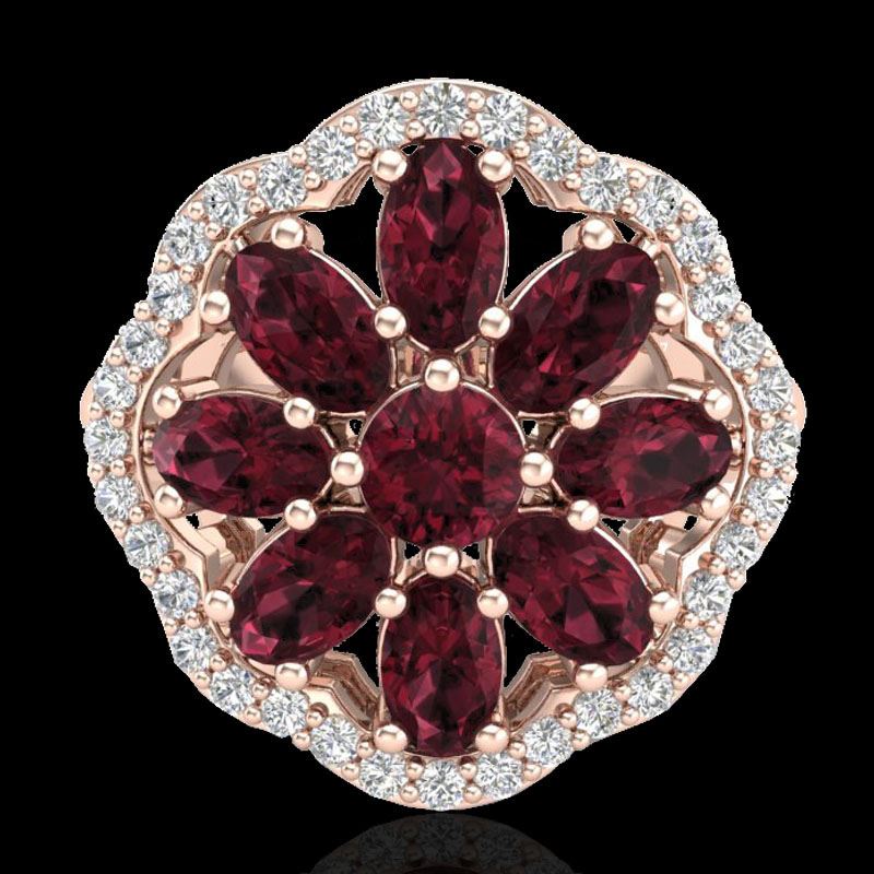 REF-52T2M -20781 ---- 3 CTW Garnet & VS/SI Diamond Cluster Designer Halo Ring 10K Rose Gold ---- Luxury Designer Brand Ring Appraised at $3,450 Certificate Number US20781 10k Rose gold, Ring Size is 7, Ring measuring approx. 7/8"X3/4" , weighing in total approx. 4.5 grams. Made in the USA and is stamped 10k, Main stone 2.35 carat total weight containing 8 pieces of Saturated purplish Red color with AAA quality Oval shape cut Garnet , Stone #2 0.15 carat total weight containing 1 pieces of Saturated purplish Red color with AAA quality Round shape cut Garnet , Stone #3 0.5 carat total weight containing 33 pieces of G-H color with VS/SI quality Round shape cut Diamond