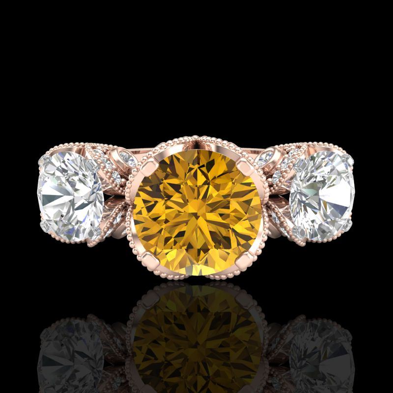 3 CTW Intense Yellow Diamond Solitaire Art Deco 3 Stone Ring 18K Rose Gold ---- Luxury Designer Brand 3 stone ring Appraised Retail Price at $25,300 ---- SKU Number US37435 18k Rose gold 3 stone ring Size is 7, 3 stone ring measuring approx. Uniform, weighing in total approx. 8.7 grams. Made in the USA and is stamped 18k, Main stone 1.00 carat total weight containing 1 pieces of Intense Fancy Yellow color with SI quality Round shape cut Diamond , Stone #2 1.14 carat total weight containing 2 pieces of H-I color with VS/SI quality Round shape cut