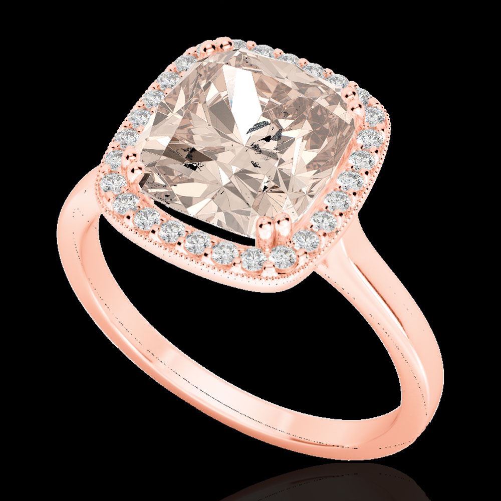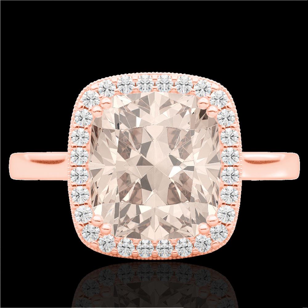 REF-63H6A -22847 ---- 3 CTW Morganite & Micro Pave VS/SI Diamond Halo Solitaire Ring 14K Rose Gold ---- Luxury Designer Brand Ring Appraised at $4,200 Certificate Number US22847 14k Rose gold, Ring Size is 6.5, Ring measuring approx. 7/16" x 7/16" , weighing in total approx. 3.7 grams. Made in the USA and is stamped 14k, Main stone 2.78 carat total weight containing 1 pieces of Medium Orange Pink color with AAA quality Cushion shape cut Morganite , Stone #2 0.22 carat total weight containing 28 pieces of H-I color with VS/SI quality Round shape cut Diamond