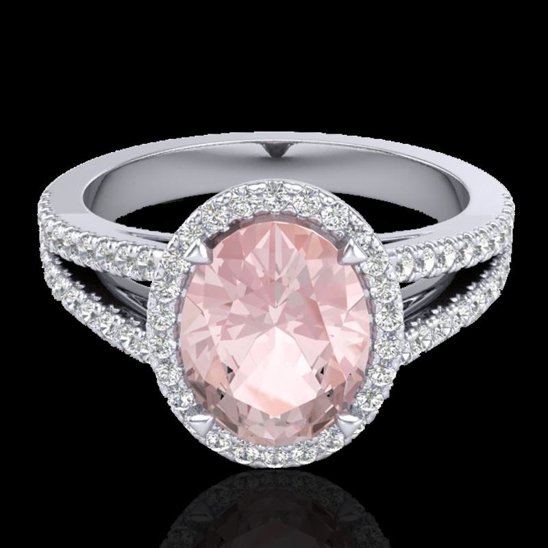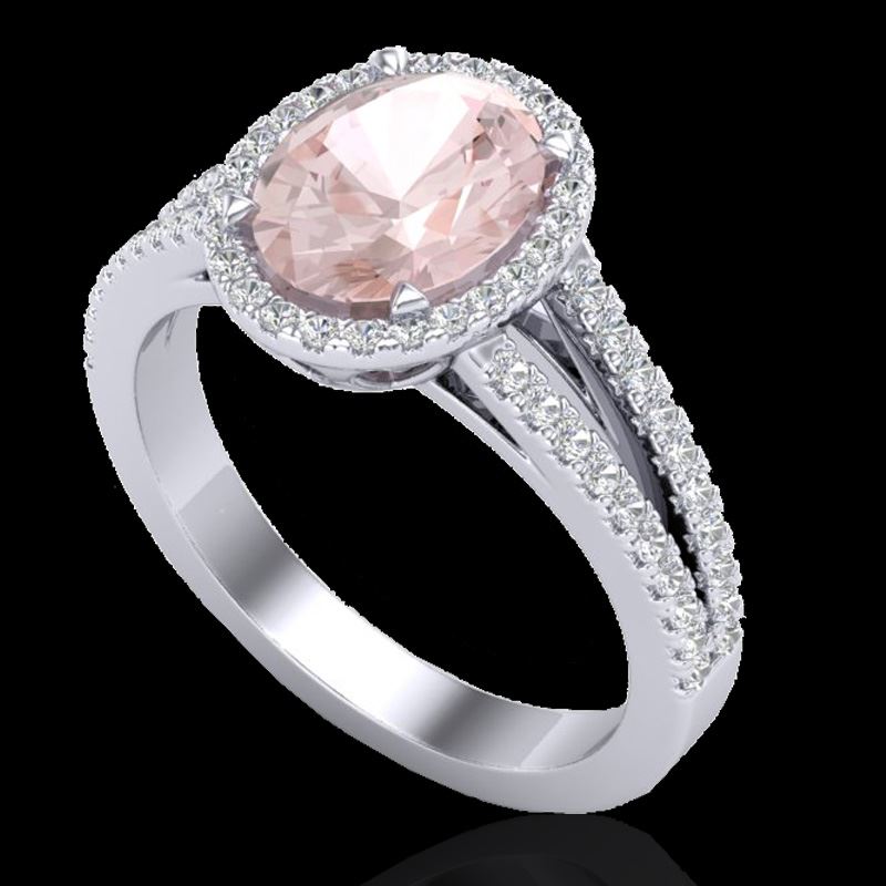 REF-86Y2K -20944 ---- 3 CTW Morganite & Micro VS/SI Diamond Halo Solitaire Ring 18K White Gold ---- Luxury Designer Brand Ring Appraised at $5,700 Certificate Number US20944 18k White gold, Ring Size is 7, Ring measuring approx. 1/2" X 1/2" , weighing in total approx. 4.5 grams. Made in the USA and is stamped 18k, Main stone 2.52 carat total weight containing 1 pieces of Medium Orange Pink color with AAA quality Oval shape cut Morganite , Stone #2 0.48 carat total weight containing 57 pieces of H-I color with VS/SI quality Round shape cut Diamond