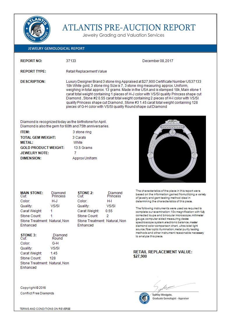 REF-563H6A -37133 ---- 3 CTW Princess VS/SI Diamond Solitaire Art Deco 3 Stone Ring 18K White Gold ---- Luxury Designer Brand 3 stone ring Appraised at $27,900 Certificate Number US37133 18k White gold, 3 stone ring Size is 7, 3 stone ring measuring approx. Uniform, weighing in total approx. 13 grams. Made in the USA and is stamped 18k, Main stone 1 carat total weight containing 1 pieces of H-J color with VS/SI quality Princess shape cut Diamond , Stone #2 0.55 carat total weight containing 2 pieces of H-I color with VS/SI quality Princess shape cut Diamond , Stone #3 1.45 carat total weight containing 128 pieces of G-H color with VS/SI quality Round shape cut Diamond