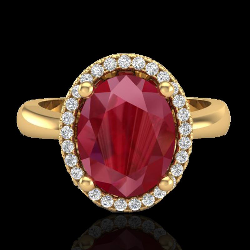 REF-64F9N -21113 ---- 3 CTW Ruby And Micro Pave VS/SI Diamond Ring Halo 18K Yellow Gold ---- Luxury Designer Brand Ring Appraised at $4,650 Certificate Number US21113 18k Yellow gold, Ring Size is 6.5, Ring measuring approx. 1/2"X1/2", weighing in total approx. 4.4 grams. Made in the USA and is stamped 18k, Main stone 2.78 carat total weight containing 1 pieces of Mid-Opaque-Deep Red color with AAA quality Oval shape cut Ruby , Stone #2 0.22 carat total weight containing 25 pieces of H-I color with VS/SI quality Round shape cut Diamond