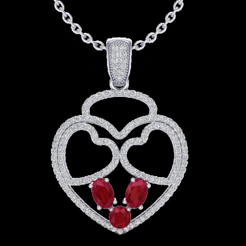 REF-117K8W -22541 ---- 3 CTW Ruby & Micro Pave Designer Inspired Heart Necklace 14K White Gold ---- Luxury Designer Brand Necklace Appraised at $9,050 Certificate Number US22541 14k White gold, Necklace Size is 16 Inches, Necklace measuring approx. 1 1/2" x 1" , weighing in total approx. 7.3 grams. Made in the USA and is stamped 14k, Main stone 1.5 carat total weight containing 2 pieces of Mid-Opaque-Deep Red color with AAA quality Oval shape cut Ruby , Stone #2 0.3 carat total weight containing 1 pieces of Strong Red color with Mid-Opaque quality Round shape cut Ruby , Stone #3 1.2 carat total weight containing 160 pieces of G-H color with VS/SI quality Round shape cut Diamond